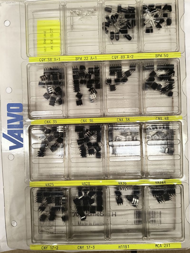 Verschenke gegen aufgerundetes Porto folgende Bauteile: 1. LED-Sortiment (war mal Bemusterung von Valvo), Typen siehe Foto; 2. Optokoppler-Sortiment dito., da sind auch Fotodioden dabei; 3. Drosselsortiment von HARTU; 4. Drosselsortiment; 5. diverse Selen-Gleichrichter für die Geriatronik, teilweise gebraucht. Versandkosten bitte per PN anfragen, gerne auch mehrere Positionen zusammen. Bezahlung per Paypal oder Überweisung möglich.