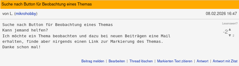 Suche nach Button für Beobachtung eines Themas Kann jemand helfen? Ich möchte ein Thema beobachten und dazu bei neuen Beiträgen eine Mail erhalten, finde aber nirgends einen Link zur Markierung des Themas. Danke schon mal!