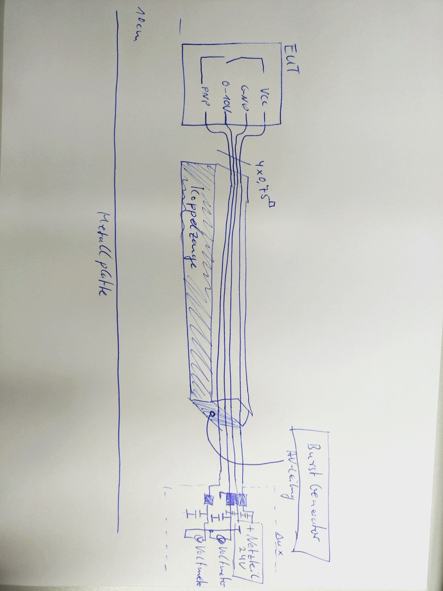 Moin, ich bin mal wieder bei meiner Burst-Thematik nach 61000-4-4. Jetzt habe ich die Möglichkeit meine Elektronik einmal an einem Generator vor zu prüfen. Ich habe eine Zuleitung mit 4-Adern: Vcc (24V), GND, Ausgang Analog und Schaltausgang zu den Vcc. Ich muss direkt 2kV auf die Versorgung koppeln. Hierzu kann ich direkt an den Burst-Generator gehen und das dort integrierte Koppel- und Entkoppelnetzwerk nutzen. Auf die Signalleitungen muss ich mit 1kV koppeln. Hierzu hab ich eine Kapazitive Koppelzange, die ich an den Generator anschließen kann. Jetzt mein "Problem": Was kann ich einfaches bauen, um mein externes Netzteil (für die 24V) und die Multimeter / Messgeräte A) zu schützen und B) nicht mit zu prüfen. Der Störer soll ja zum EUT gehen. Habe mal eine Skizze angehängt. Reicht hier etwas Serieninduktivität + Kondensatoren nach Masse / Metallplatte je Leiter? Es sind nur maximal 300mA je Leiter. Habt ihr hier DIY Tipps was sich für einen kleinen Laboraufbau bewährt hat? Schönen Abend
