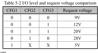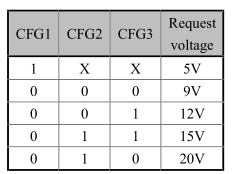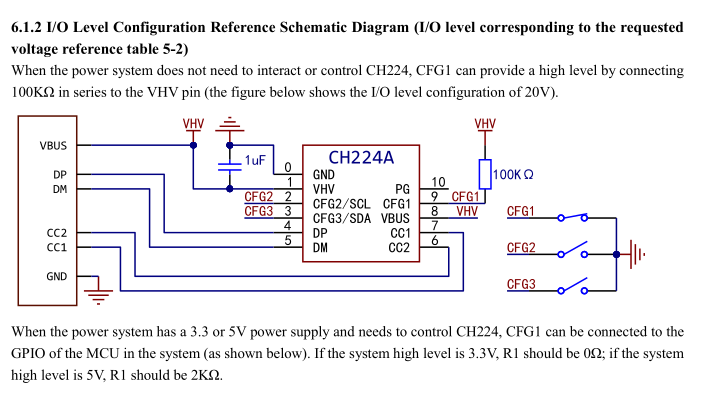 Ich versuche gerade vom CH224K auf den CH224A umzusteigen. Die Schaltung ist wie im Datenblatt V2.0, siehe Bild. Dabei tritt dieses Problem auf, wenn der Schalter für CFG1 an ist (CFG1=0) und die Schalter für CFG2 und CFG3 aus sind (CFG2=1 und CFG2=1): Der CH224A fordert zuerst 15V an, wie er soll. Und bekommt sie. Sofort danach fordert er 20V an und bekommt sie. Was nicht gut ist. CFG2 und CFG3 direkt an (externe) 3,3V hilft nicht. Alle anderen Kombinationen der Schalterstellungen funktionieren, wie sie sollen, also 5V, 9V, 12V und 20V. Gleicher Effekt mit zwei verschiedenen USB-C-Netzteilen. Beim CH224K hat's funktioniert (da ist die Stromversorgung natürlich etwas anders). Weiß einer von euch Rat? Hier ist der Datenverkehr auf CC laut PulseView. Seltsam ist, daß das Netzteil zunächst die 20V nicht anbietet. Sobald es das tut, will der CH224A sie haben. Der besseren Lesbarkeit wegen habe ich die Zeiten etc. weggelassen. SNK[0]: VDM - [1] REQ Disc Ident SVID:ff00 SRC/UFP[0]: GOOD CRC SRC/UFP[0]: VDM - [1] ACK Disc Ident SVID:ff00 - [2] VDO:18602e87 - [3] VDO:00000000 - [4] VDO:00000000 - [5] VDO:00082040 SNK[0]: GOOD CRC SRC[0]: SOURCE CAP - [1] [Fixed] 5V 3A (15W) [unconstrained] - [2] [Fixed] 9V 3A (27W) - [3] [Fixed] 12V 3A (36W) - [4] [Fixed] 15V 3A (45W) - [5] [Programmable|PPS] 3.3/5.9V 5A SNK[0]: GOOD CRC SNK[0]: REQUEST - [1] (PDO #4: Fixed 15V) 3A (operating) / 3A (max) [comm_cap] [no_suspend] SRC[0]: GOOD CRC SRC[1]: ACCEPT SNK[1]: GOOD CRC SRC[2]: PS RDY SNK[2]: GOOD CRC SNK[0]: VDM - [1] REQ Disc Ident SVID:ff00 SRC/UFP[0]: GOOD CRC SRC/UFP[0]: VDM - [1] ACK Disc Ident SVID:ff00 - [2] VDO:18602e87 - [3] VDO:00000000 - [4] VDO:00000000 - [5] VDO:00082040 SNK[0]: GOOD CRC SRC[0]: SOURCE CAP - [1] [Fixed] 5V 3A (15W) [unconstrained] - [2] [Fixed] 9V 3A (27W) - [3] [Fixed] 12V 3A (36W) - [4] [Fixed] 15V 3A (45W) - [5] [Programmable|PPS] 3.3/5.9V 5A SNK[0]: GOOD CRC SNK[0]: REQUEST - [1] (PDO #4: Fixed 15V) 3A (operating) / 3A (max) [comm_cap] [no_suspend] SRC[0]: GOOD CRC SRC[1]: ACCEPT SNK[1]: GOOD CRC SRC[2]: PS RDY SNK[2]: GOOD CRC SRC[3]: SOURCE CAP - [1] [Fixed] 5V 3A (15W) [unconstrained] - [2] [Fixed] 9V 3A (27W) - [3] [Fixed] 12V 3A (36W) - [4] [Fixed] 15V 3A (45W) - [5] [Fixed] 20V 5A (100W) - [6] [Programmable|PPS] 3.3/21V 5A SNK[3]: GOOD CRC SNK[1]: REQUEST - [1] (PDO #5: Fixed 20V) 5A (operating) / 5A (max) [comm_cap] [no_suspend] SRC[1]: GOOD CRC SRC[4]: ACCEPT SNK[4]: GOOD CRC SRC[5]: PS RDY SNK[5]: GOOD CRC