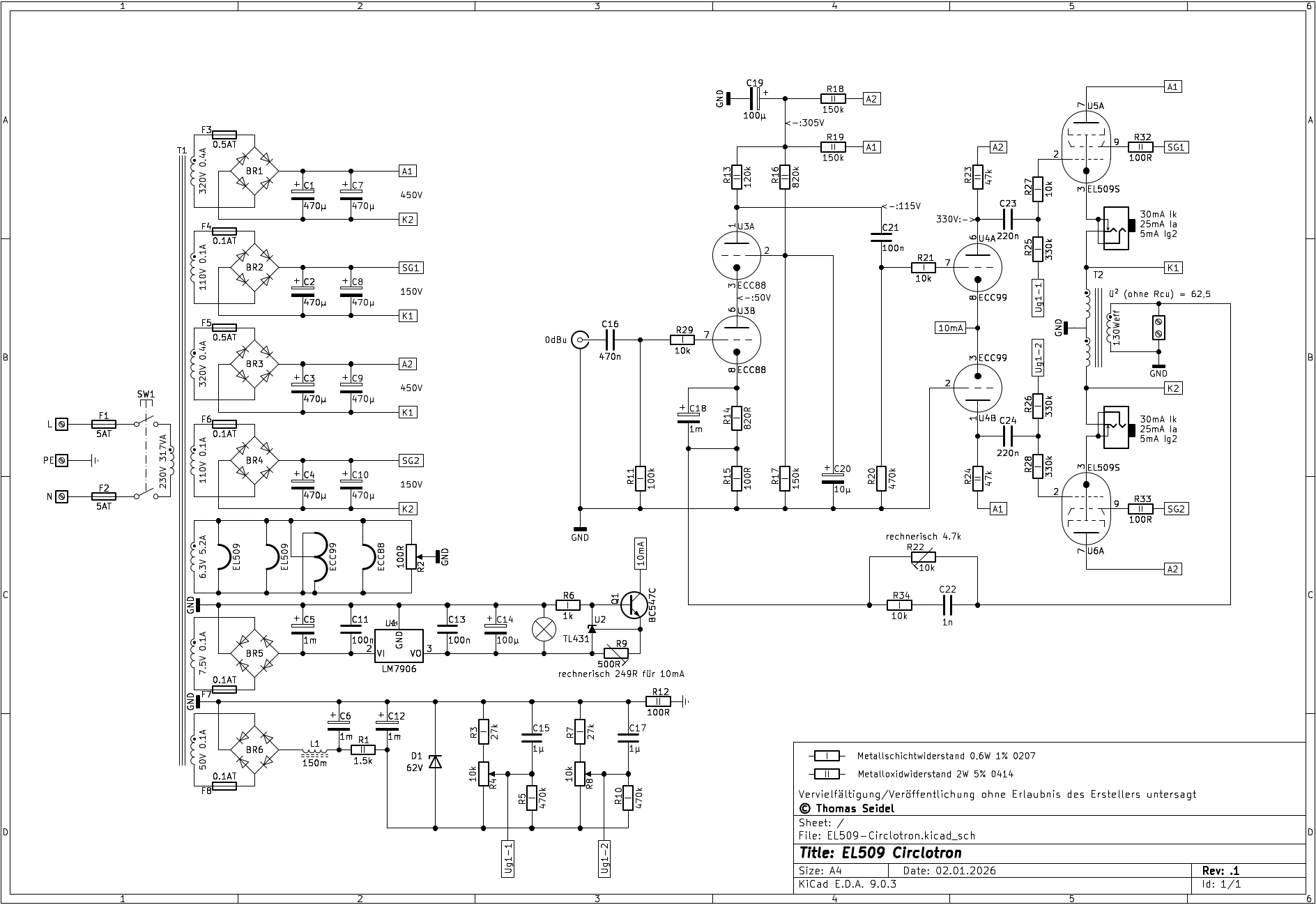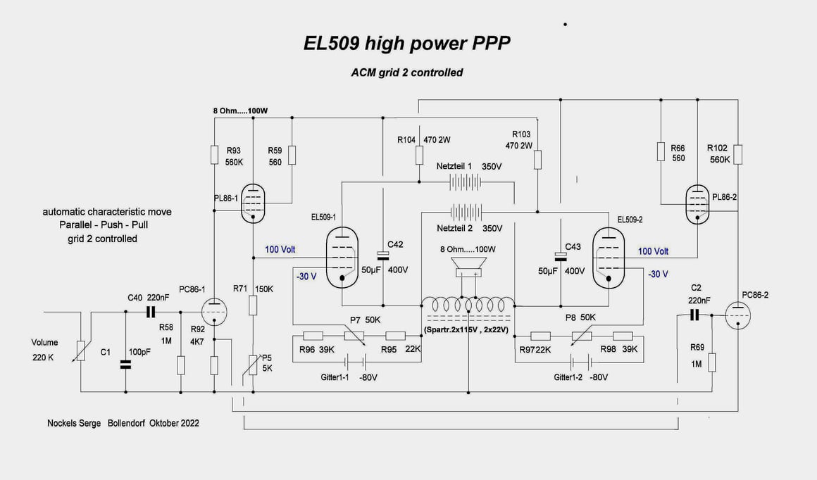 Das hast du dir bei Jogi abgeschaut https://www.jogis-roehrenbude.de/Leserbriefe/Dietmar_Ragoss-100W_PPP_Monobloecke_PL509/100W_PL509_Circlotron_2014.htm Naja, wer in einem Audio-Amplifier mit Röhren Step-Down-Schaltwandler verwenden will, sollte es lieber gleich ganz bleiben lassen. Aber egal, mach mal. Ansonsten ist es fragwürdig, warum man unbedingt die Circlotron-Schaltung mit ihren Problemen verwenden will. Außerdem ist die E/PL509 in Pentoden-Schaltung nur mit Steuergitter Ansteuerung auch nicht gut bedient. Entweder ganz als Triode geschaltet verwenden (Schirmgitter über 100…200 Ohm Schutzwiderstand direkt mit der Anode verbunden) oder mit kombinierter G1/G2-Ansteuerung, wie es z.B. Alan Kimmel gemacht hat, bzw. auch reiner Schirmgitter-Ansteuerung. Zur Schirmgitter-Ansteuerung und Circlotron-Schaltung gibt es da eine nette Idee, siehe Anhang. Das umgeht dann auch gleich das Problem mit der Erzeugung der gegenüber der Anodenspannung niedrigen Schirmgitterspannung. Vorsicht vor den modernen EL509 mit Oktal-Sockel. Die von Swetlana entsprechen zwar von den Daten her den ursprünglichen EL509 mit Magnoval-Sockel, haben aber oftmals Glasprobleme wegen des Oktal-Sockels. Die EL509 von JJ sind gar keine echten EL508 sondern nur „aufgebohrte“ EL34, was man schon am System-Aufbau gut erkennt. Nehme die russische 6P45S, die eine echte EL509 ist, wenn man schon keine NOS EL509 bekommen kann. Trotz allem, erfolgreiches basteln, auch wenn du da 10…20…30…40… Jahre zu spät kommst.