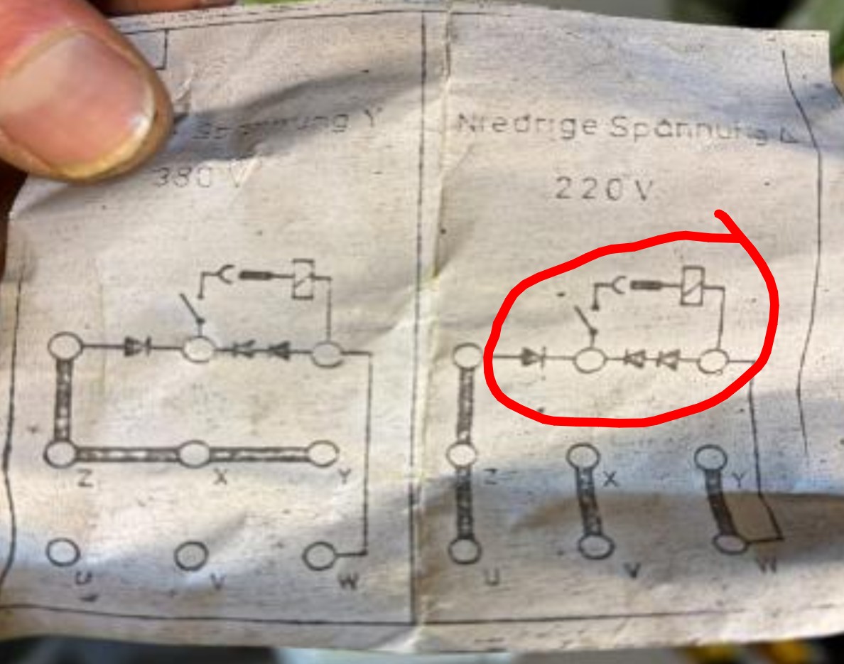 Hi zusammen, habt ihr eine Idee, was das rot eingekreiste sein könnte? Ich vermute ein Relais zur Ansteuerung einer Bremse. Aber wieso die Diode von U zum Schalter/Relais? Die zwei seriellen Dioden von W nach U braucht man als Freilaufdiode und zum Halten des Relais während der negativen Halbwelle von U? Könnte die Relaisspule eine Gleichspannung brauchen? Dankeschön, Patrick