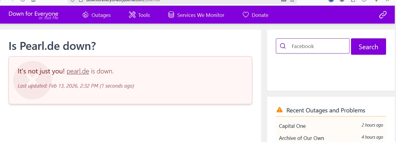 Tipp: Es gibt Seiten, mit denen man prüfen kann, ob eine Seite generell down ist, oder ob das Problem auf der eigenen Seite liegt. Beispielhaft sei https://downforeveryoneorjustme.com/pearl.de genannt.