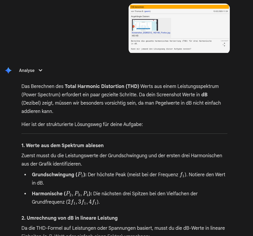 Berechne die gesamte harmonischee Verzerrung (THD) für drei Harmonische in dB. Kann mir jemand den Lösungsweg dieser Aufgabe nennen?