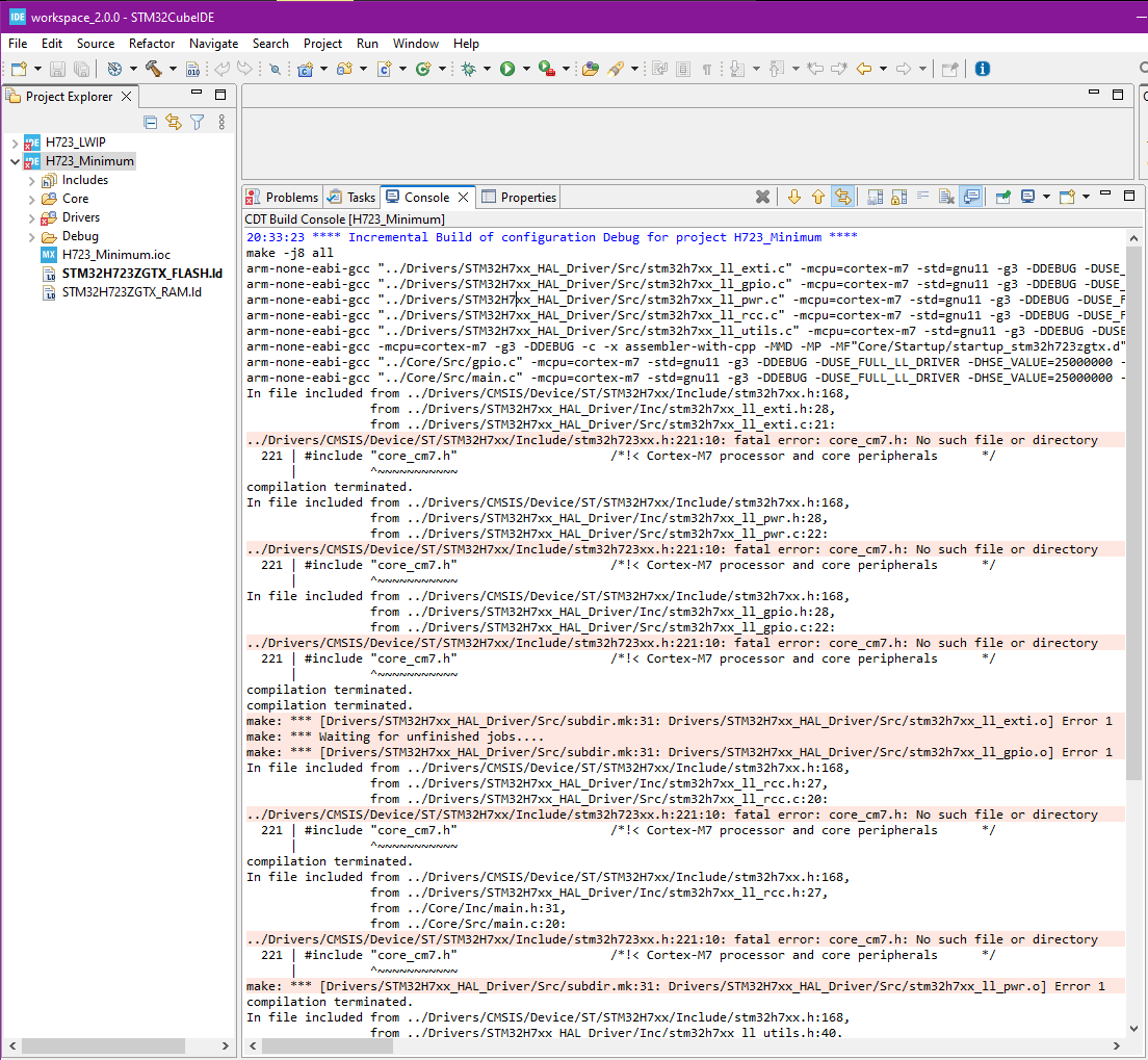 Es ist zum Verzweifeln. Wie man hier sieht Beitrag "Neues Blackboard mit STM32H723" befasse ich mich mit einem neuen Blackboard mit STM32H723- Controller drauf. Leider gelingt es mir (besser gesagt CubeMX) nicht einen fehlerfrei compilierbaren Quellcode zu generieren. Könnte bitte jemand (es dürfen auch bitte mehrere sein) mal sein CubeMX inklusive CubeIDE anwerfen um zu prüfen ob das "überall" so ist wie bei mir. Bevor ich mich zu STM ins Forum aufmache hätte ich gerne die eine oder andere Bestätigung für das Versagen. Sowohl eine Minimal-Konfiguration als auch eine vergrösserte mit LwIP-Einbindung machen Fehler beim ersten Compilieren. Es wird ein Teil der CMSIS nicht mit eingebunden (los geht's mit core_cm7.h). Man kann das zwar nachträglich von Hand aus dem Firmware-Repository reinkopieren aber beim nächsten Generierungs-Lauf werden die Dateien von CubeMX wieder gelöscht. Wenn das schon nicht schlimm genug wäre, beim LwIP-Projekt fehlen - bis auf ein paar wenige - praktisch alle Sourcen die das LwIP ausmacht, sogar die Directory-Strukturen fehlen. Im Anhang zwei *.ioc Dateien sowie ein Screenshot wie das beim Compilieren aussieht. CubeMX ist Version 6.16.1 CubeIDE ist Version 2.0 Firmware für den H7: STM32Cube_FW_H7_V1.12.0 gepatcht auf 1.12.1 Also alles auf neuestem Stand. Kann doch eigentlich nicht sein dass CubeMX noch nicht auf Stand des STM32H723 angekommen ist? Könnte das bitte jemand mal checken?