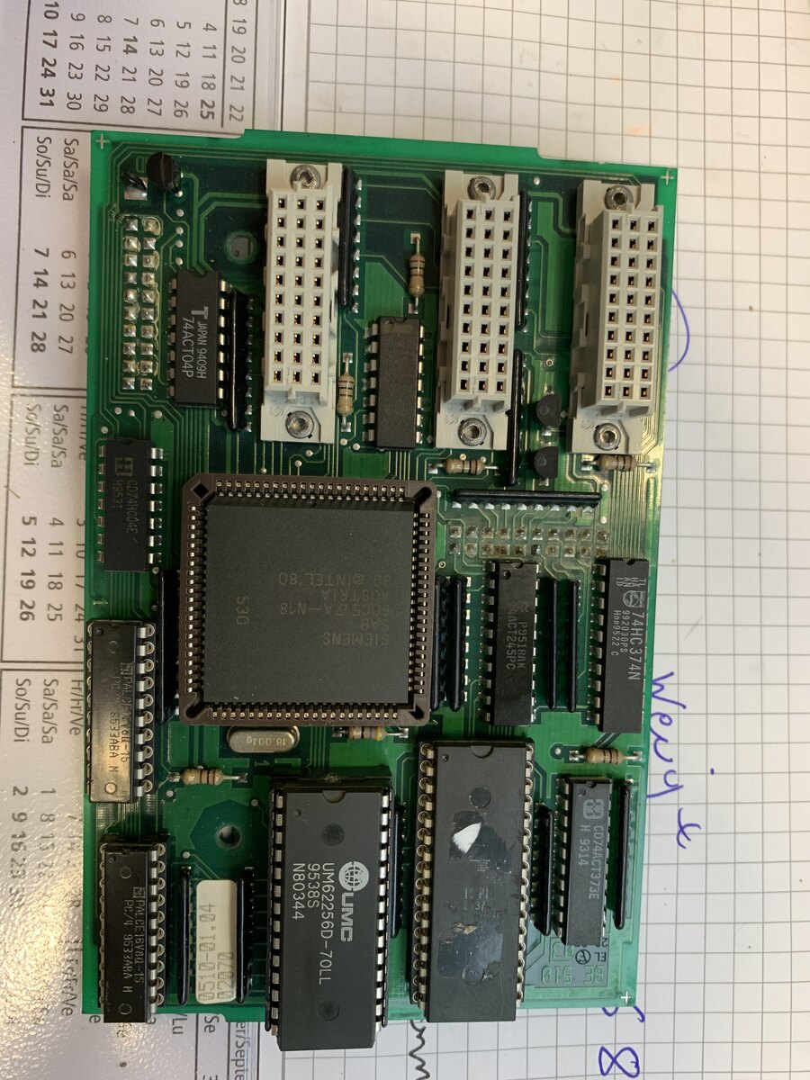 Der EPROM ist rechts daneben. Da wurde das Etikett abgerissen, aber die Beschriftung kann man trotzdem nicht lesen.