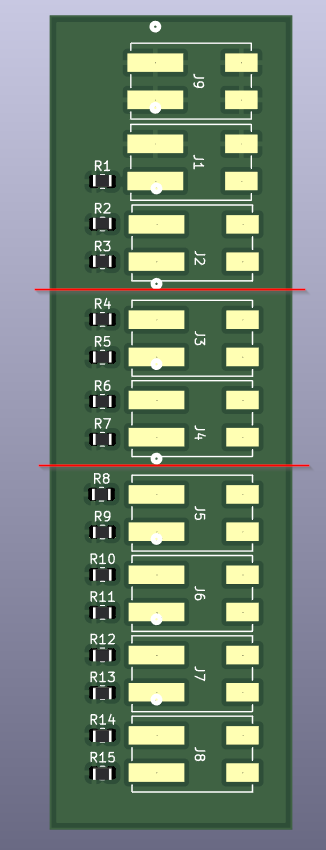 Hallo zusammen, ich plane eine kleine Platine die einfach nur Widerstandskombinationen rausführt. Nun möchte ich dort (rote Linie) 2 Sollbruchstellen einbauen. Die Platine ist voll mit Maße aufgefüllt. Wie mache ich da am besten Sollbruchstellen? V-CUT wird ja schlecht gehen. Ich nutze KiCad.