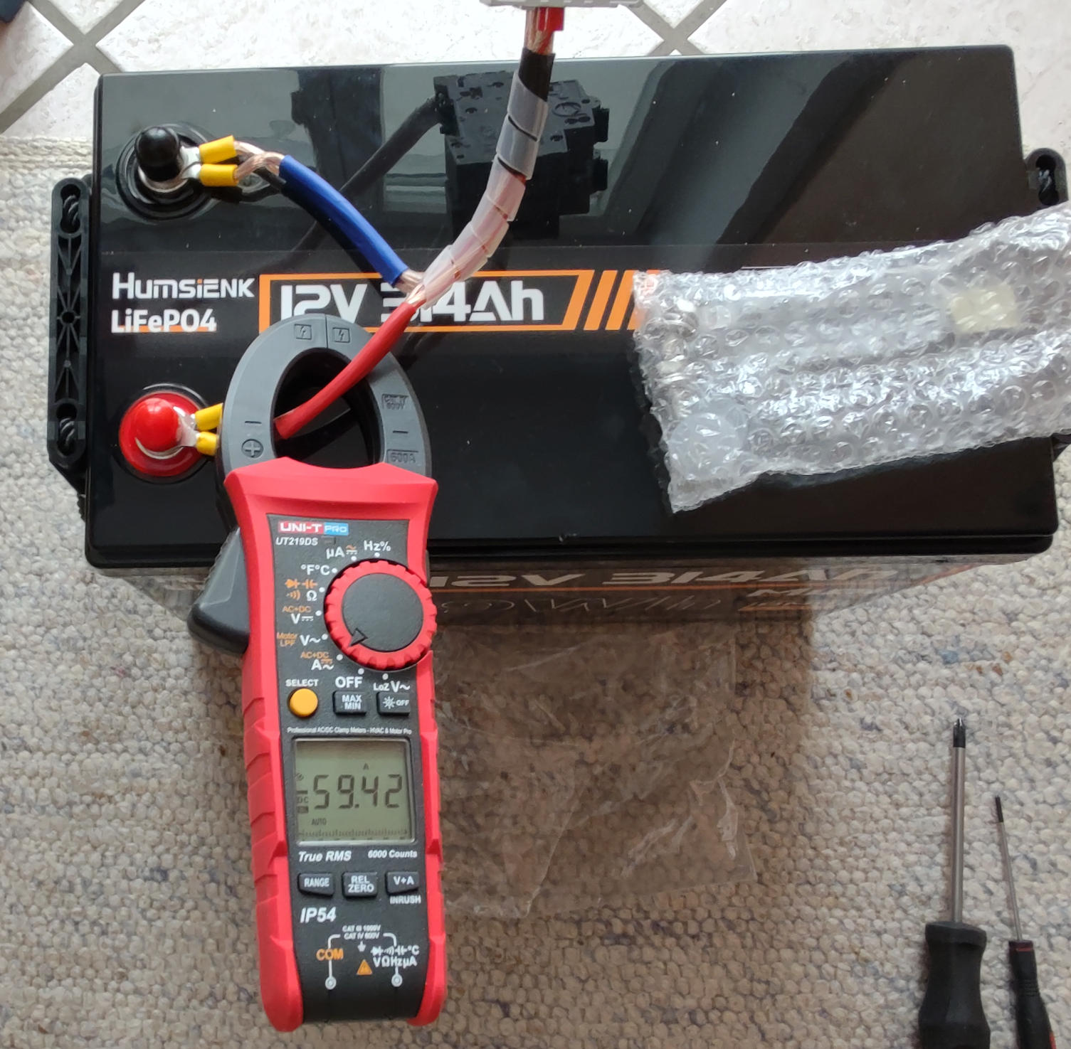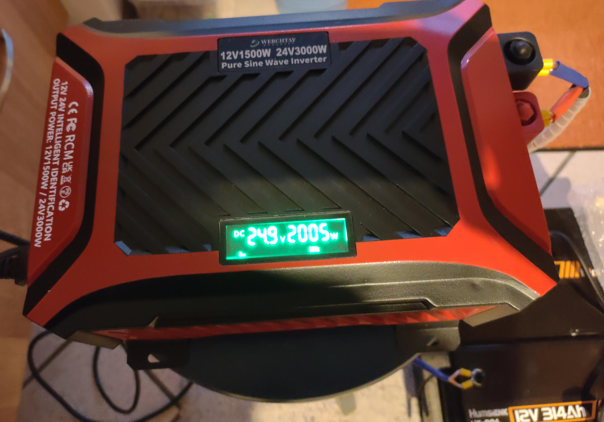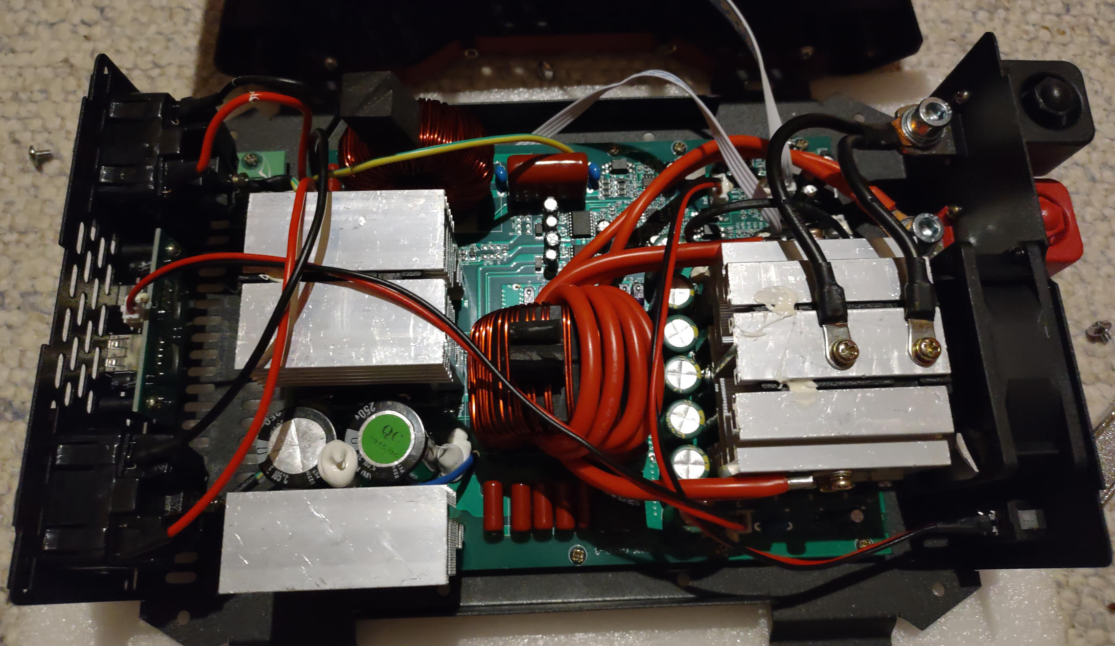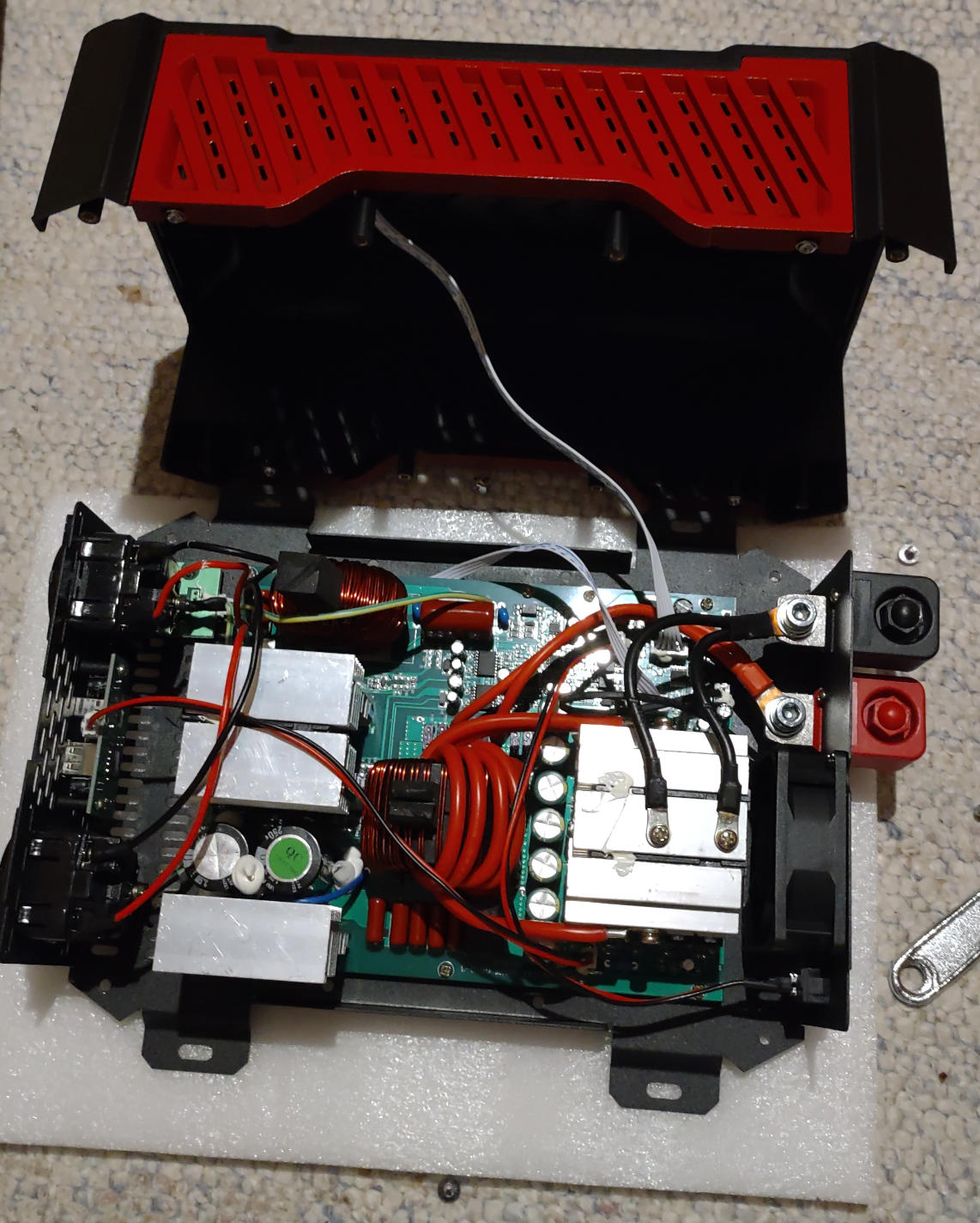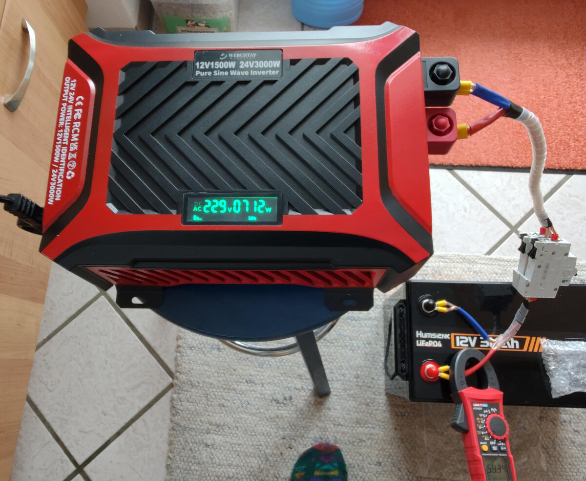 Hallo Forum, ich habe mir den o.g. Inverter (12V und 24V mit auto-detect) bei Aliexp. besorgt um Verbraucher, z.B. Wasser-Kocher, aus einem LiFePo4 Akku (300Ah) zu versorgen. Mein erster kurzer und subjektiver Eindruck war soweit ok. Getestet wurde der Inverter mit einem 12V Akku mit einer 700W Last (Toaster) und mit einem 2000W Wasserkocher an zwei 12V Akkus im 24V Modus. Der interne Aufbau des Inverters ist auch im Anhang abgebildet. Längere-Tests (einige zig Minuten an der Last) werden noch folgen, dazu muss ich mir aber erst passende Kabel machen. Der Inverter war bei Ali für nur 100 Euro zu haben. Da hatte ich nicht so viel erwartet, wollte aber trotzdem einen Versuch wagen. Der Inverter ist nicht in einem Aluprofil verbaut, sondern hat eine Kombi-Kunststoff/Metall-Abdeckung. Das sieht man aber beim Angebot nicht so genau. Aus diesem Grund habe ich einen TinySA mit einer Antenne direkt in der Nähe (50cm) des Inverters positioniert um einen ersten Eindruck über das abgestrahlte RF-Spektrum zu bekommen. Die kleine Teleskop-Antenne ist über einen 5dB Att am TinySA angeschraubt. Das gezeigte Spektrum geht bis 120MHz, deckt also auch die UKW Frequenzen ab. Ich habe nur schnell gemessen und der TinySA ist nicht im Max-Hold Modus, so dass mir eventuell einige Spektrallinien nicht angezeigt werden. Eine genauerer Messung werde ich noch mit einem richtigen SA in der Arbeit machen. Hoffe diese Infos sind für den einen oder anderen von Interesse und helfen bei der Wahl eines Inverters. Bitte den Beitrag nicht als Kaufempfehlung werten. Ist nur meine subjektive Darstellung zu dem besagten Gerät. Falls Ihr bessere aber kostengünstige Inverter kennt, so könnt Ihr diese gerne hier nennen. De Markt ist ja sehr vielfältig und es ist nicht so einfach eine Entscheidung beim Kauf zu treffen. Markus