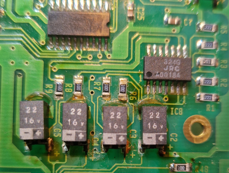 Rechts die Spannungsteilerkette aus 5x 2k2 mit 4 Abgriffen, die auf den LM324 als Impedanzwandler gehen (Spannungsfolger). An den Ausgängen dann die 4 Elkos, die über 10Ω geladen werden. Das sind die Hilfsspannungen für das LCD Ersetze die doch mit 47uF MLCC, wird funktionieren. Siehe auch Resistor Ladder Biasing https://ww1.microchip.com/downloads/en/appnotes/01428a.pdf Messe anschließend die Spannungen, die müssen gleichmäßig aufgeteilt an den Elkos (bzw. dann MLCC) liegen. Alles gut säubern und prüfen, ob die Leiterbahnen schon angegriffen sind.