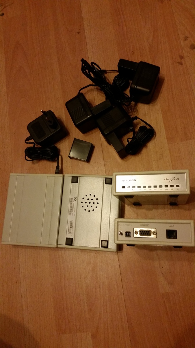 Biete insgesamt 4 Stück Devolo MicroLink 56k i Modems inklusive Netzteil. Passende Kabel für die Line-Buchse müsste ich auch noch haben, suche ich bei Bedarf gerne noch raus. Die Geräte waren noch nie wirklich im Einsatz, auf der Frontblende ist sogar noch die Schutzfolie. Die Geräte liegen inzwischen aber schon viele Jahre bei mir ungenutzt herum. Ich habe sie eingeschaltet und sie sind augenscheinlich Funktionstüchtig, für weitere Tests habe ich keine Möglichkeit. Pro Stück 20€ VB, zzgl. Porto.