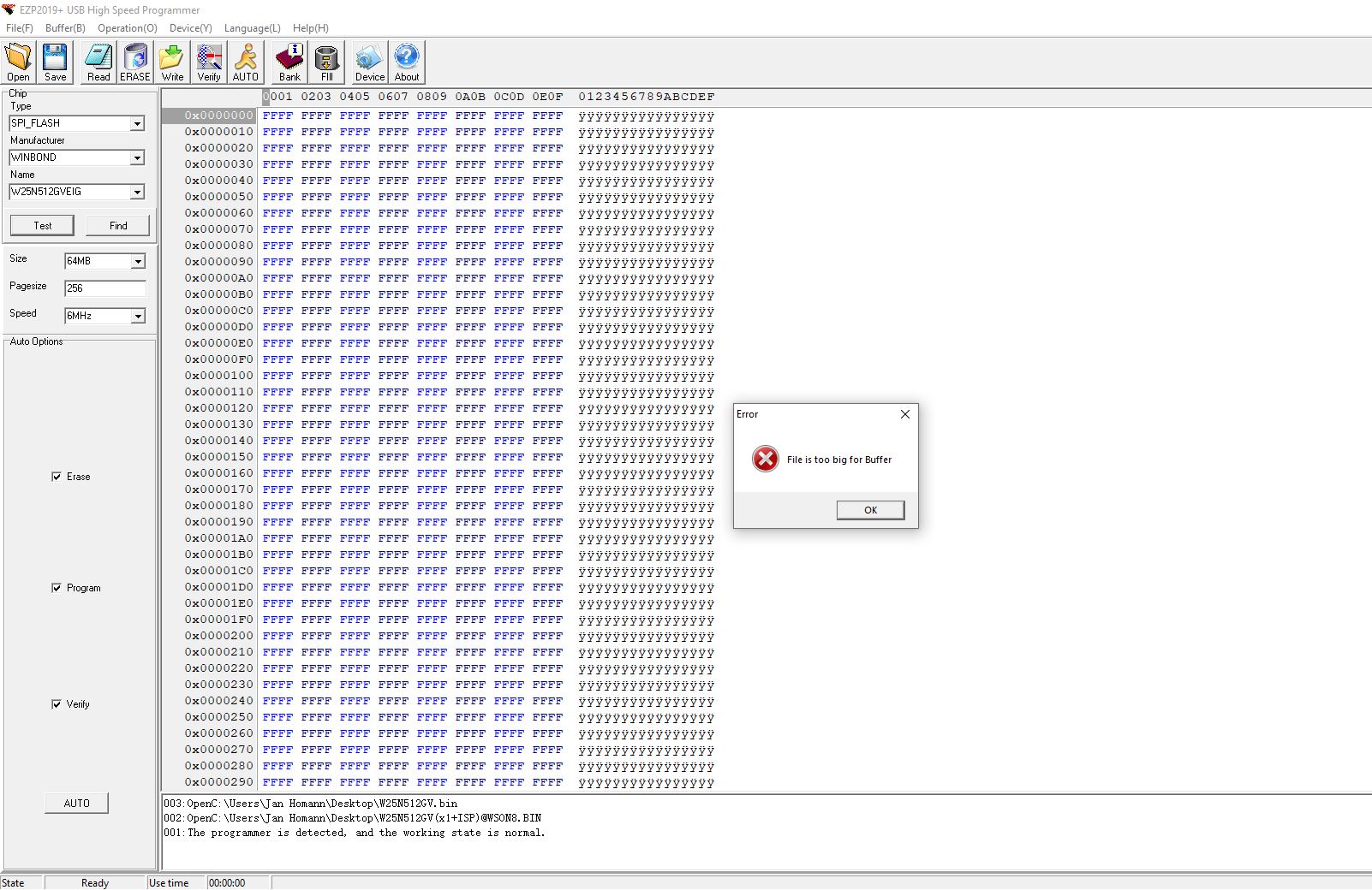 Ich bekomme dieses Dump (was weiter oben im Link, von einem anderen Thread stammt) nicht geflasht, was mache ich falsch? Das Programm (EZP2019+) sagt mir ständig das dass File zu groß für den Puffer währ.. Im Screenshot sieht man wie ich den angelegten Chip parametriert habe.