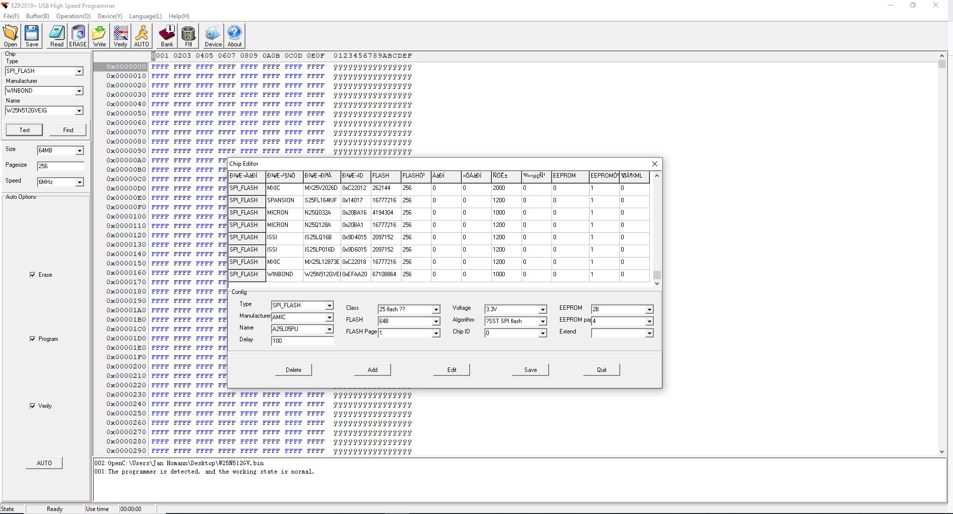 Wenn ich versuche den Dump aus dem Link weiter oben zu flashen sagt mir das Tool "EZP2019" (für meinen Flash Progammer) das die Datei zu groß währe für den Puffer. Vermutlich habe ich den Chip nicht richtig parametriert in der Software, da ich ihn neu anlegen musste aufgrund von nicht vorhanden sein.