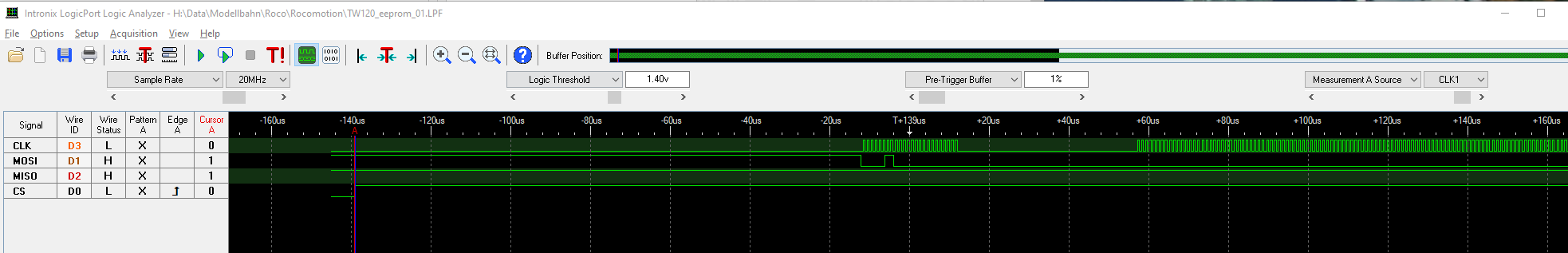 zumindest CS, MOSI und CLK mit dem LA gecheckt.
