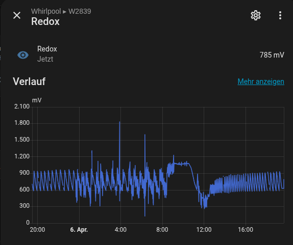 Hallo Tom Ich meinte eigentlich für einen Ozongenerator zu steuern ist der ORP der einfachste Weg. Von wo die Schwankungen kommen weiß ich leider nicht, aber ich vermute das der W2839 daran schuld ist. Ich bin gerade dabei das ganze über Home Assistant zu steuern und den W2839 auszutauschen gegen 2 Module, von Texas Instruments, CC2530 und den ADS1115. Software (gratis) und Programmiergerät CCDebugger ist alles bei Ali Express erhältlich. Den Analog-digital-Wandler bau ich komplett isoliert auf. Den Strom mit Traco Power TBA 0510 und den I2C-Bus mit den ISO1540. Bei dem Whirlpool habe ich es geschafft mit dem Venturi-Injektor und den Statischen Mischer (Reaktor) das kein Ozon mehr entweicht bzw. keines mehr zu riechen ist,was bedeutet das auch fast keines mehr austritt. Leider habe ich kein Labor die solche teuren Messgeräte haben um das zu überprüfen. Was ich gelesen habe soll man für den Teich nur um die 300 mV ORP haben. Noch was, die ORP Sonde wird mit einer Pufferlösung mit 650 mV kalibriert. Eine Platin-Sonde ist erst jetzt auf den Weg zu mir. Bis jetzt habe ich nur die unter 20 € Sonden verwendet, weil ich erst jetzt so eine Auswertung durch Home Assistant habe.