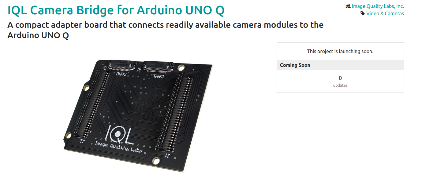 Der Arduino Uno Q bietet sich ob seiner hohen Rechenleistung für verschiedene Aufgaben im Bereich Computer Vision an. Problematisch war bisher, dass es für die Platine keinen Adapter gab, der die Verbindung mit den weit verbreiteten Raspberry Pi-Kameras ermöglicht. Im Hause IQL lanciert man nun ein Crowdfunding-Projekt, das wie in der Abbildung gezeigt die Lösung dieses Problems zum Ziel hat.