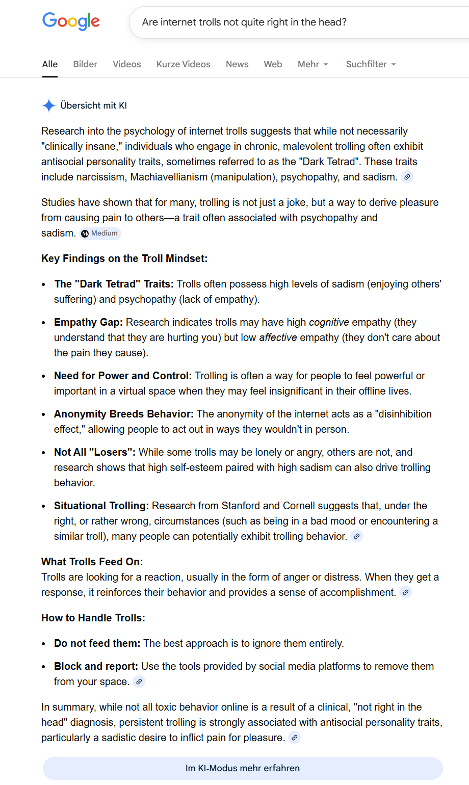 Auch die KI meint, dass Internet-Trolle nicht krank sind (d.h. keine Krankschreibung verdienen), aber ganz normal sind sie dennoch nicht.