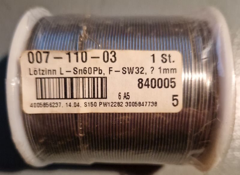 Im Angebot eine noch eingeschweißte 1Kg-Rolle 1mm bleihaltiges Lötzinn mit Flussmittel, optimale Größe für Modellbahn oder Reparaturen an alter freiverdrahteter Technik wie Röhrengeräte o.ä. Preis inkl. Versand mit DHL oder Hermes nach Wahl = 60€. Gern Zahlung per Paypal, Versand erfolgt umgehend mit Angabe der Sendungsnummer. Grüße