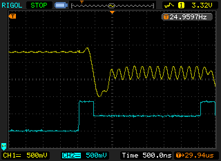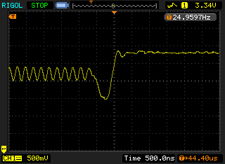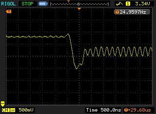 Hier die fallende Flanke vom linken Bildschirmrand. Da gibt es sogar zum Begin der Flanke ein Überschwingen?!? Ist da irgendwo ein Hochpass falsch dimensioniert? Schließlich werden die Signale am Encoder mehrfach durch externe Netzwerke geführt.