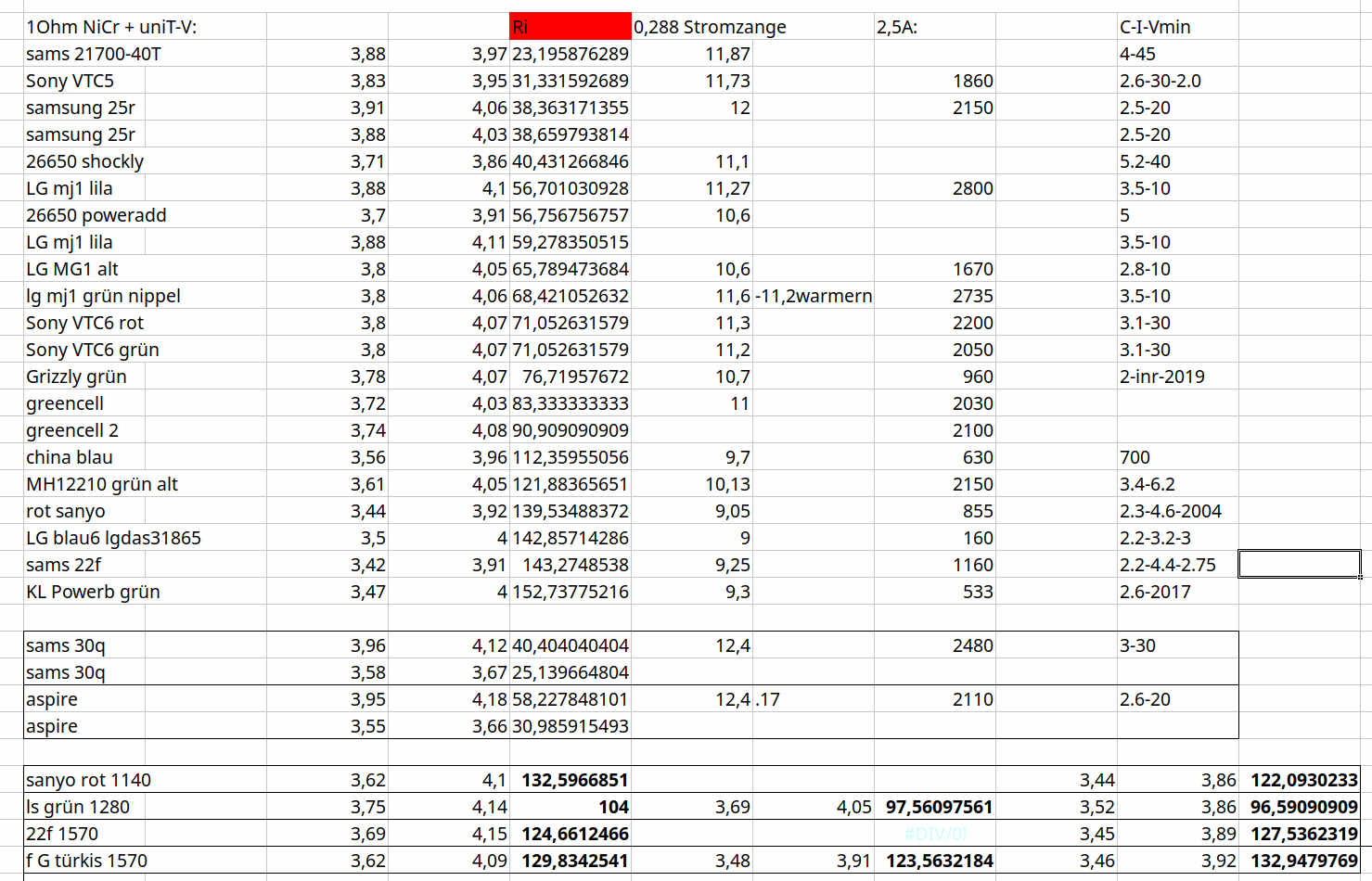 um gebrauchte Akkus auszusortieren, die Messwerte sind von ner wilden Auswahl von Akkus. 2,5A Spalte, gemessene mAh. Stromzange Spalte ist Messung mit Stromzange mit niedrigem Widerstand.