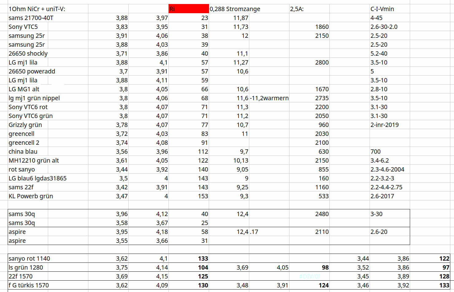 Anmerkungen zu Messwerten: china blau ist die in dem avif Bildern mit 1500mAh Aufdruck. Man könnte es auch als Kracher bezeichnen, an sich sauber gefertigt und bestimmt nicht schlecht (50cent Wunder), war bei nem Gadget dabei. Zum Ende hin sammeln sich ältere Zellen. Letzte Spalte C Kapazität, I max Strom Datenblatt, V min Trennspannung Datenblatt, etwas durcheinander. KL Powerb war ne Powerbank für 4 Euro von Kaufland ca. 2017, die noname Zellen darin sind nicht mit Markenakkus vergleichbar, haben stark an Kapazität verloren und einer ist vorzeitig starker Selbstentladung zum Opfer gefallen. Zum Thema: https://www.youtube.com/shorts/9L8SBgOP700 zb2l3 mit 1,5R, max 3A rated https://www.youtube.com/watch?v=kP9w6Dx6cuA
