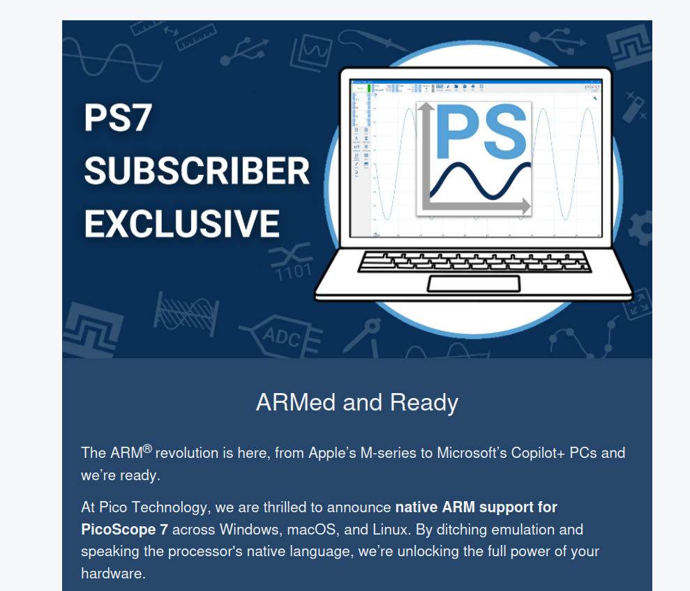 Im Hause PicoScope nutzt man den „PC“ seit jeher als Basis für die Ausführung von Decoder und Co. Aus der Logik folgt, dass eine „effizientere“ Ausnutzung der PC-Ressourcen direkt zu einer besseren Usability beiträgt. In einer vor wenigen Stunden an die Nutzerschaft versendeten Meldung verkündet man nun - wie in der Abbildung gezeigt - die Intention, auf ARM-Prozessoren basierende Workstations fortan vollständiger unterstützen zu wollen.