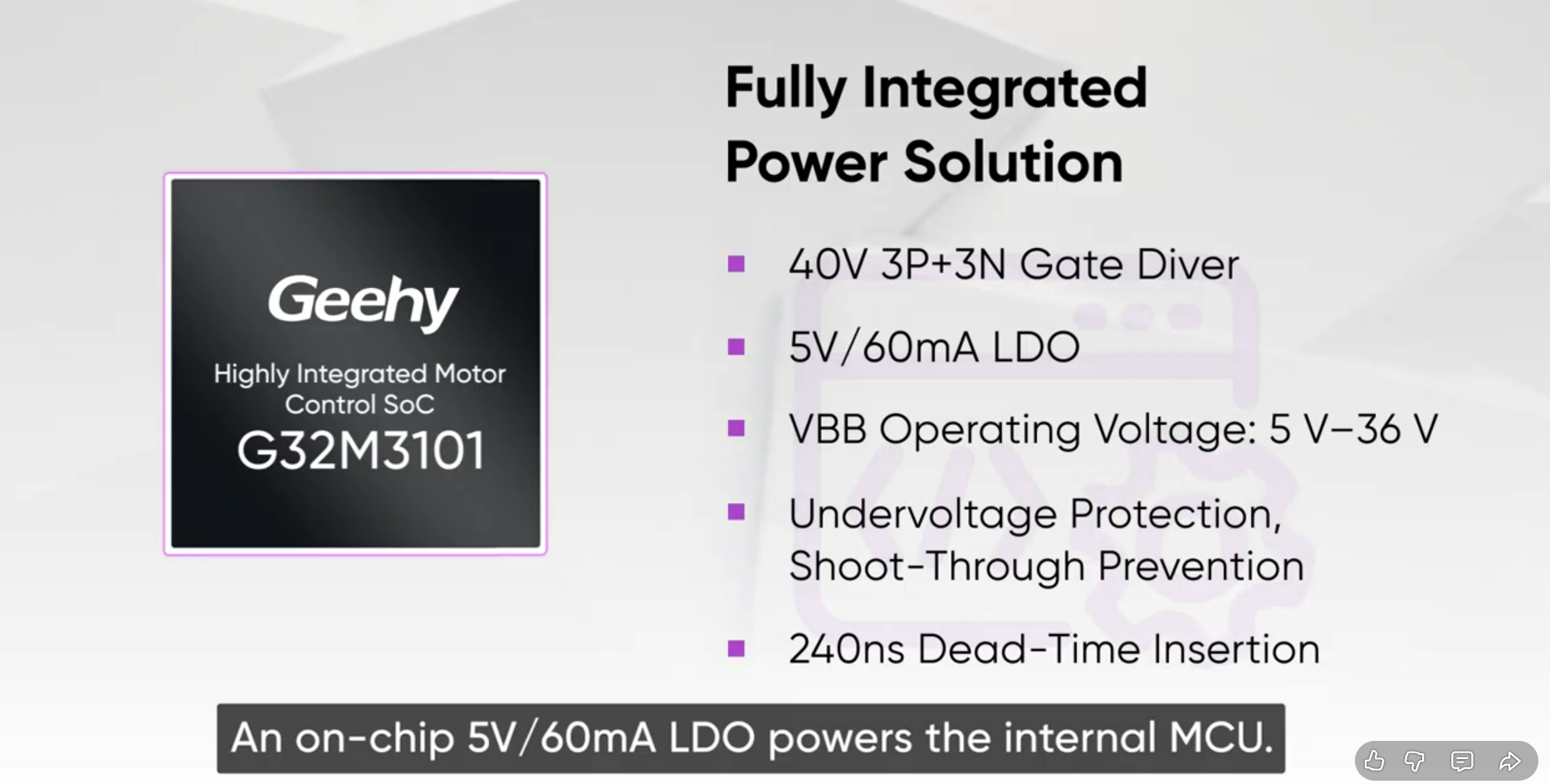 Für die Motorsteuerung spezialisierte Mikrocontroller sind per se keine wirklich neuen Produkte. Im Hause Geehy gibt es nun eine neue MCU, die - derzeit nur in Form eines YouTube-Videos angekündigt - durch sehr hohen Integrationsgrad zu beeindrucken sucht. Unter anderem gibt es einen am Chip integrierten LDO, der anscheinend aus der Motorspannung die für die MCU-Versorgung relevante Spannung zu generieren sucht.