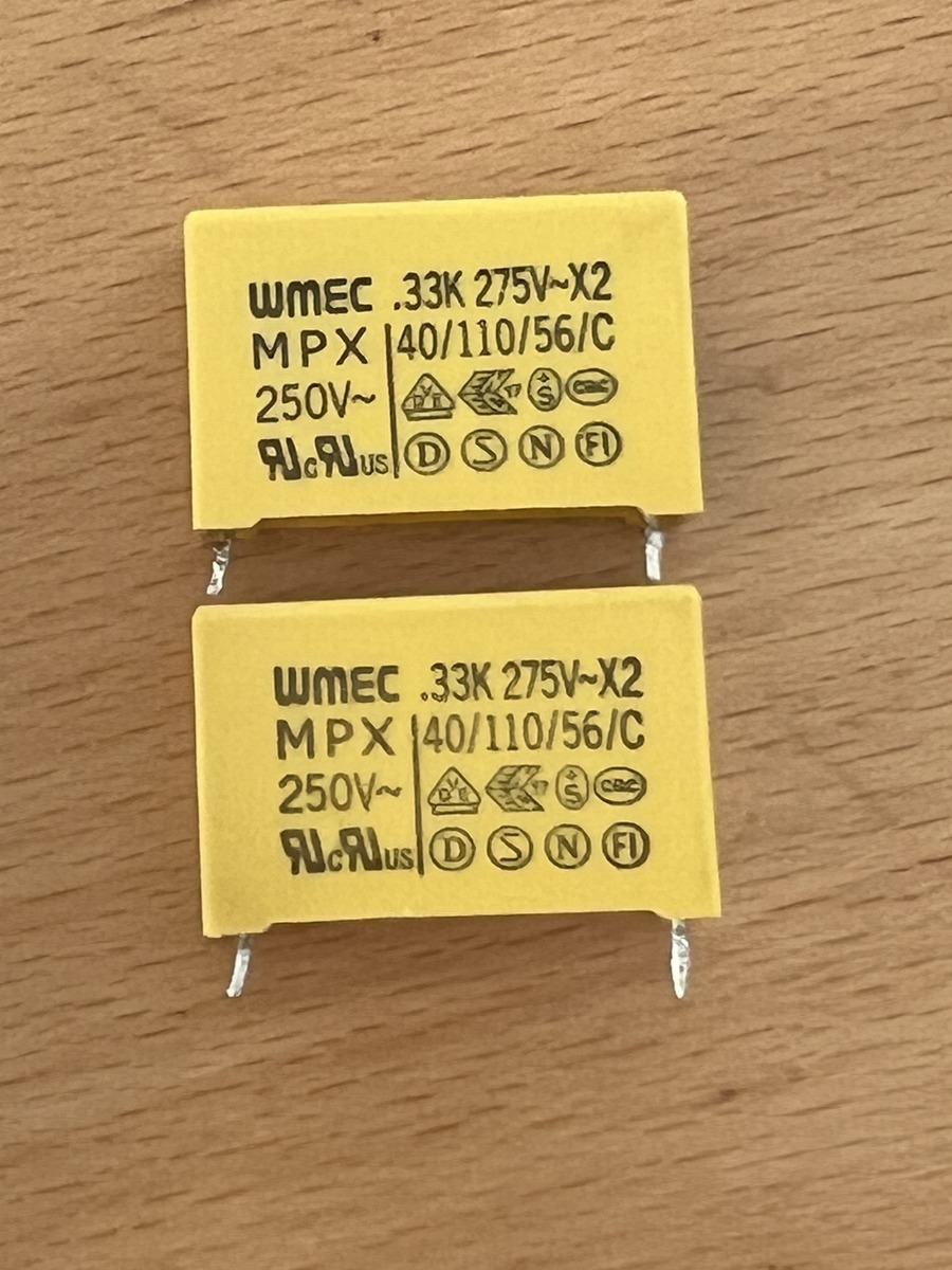 Der Ladeelko hat 330u / 400V. Ein gängiger Sicherungsautomat hält das nach meiner Erfahrung auch ohne Vorwiderstand aus. Aber man weiß ja nie wie schnell die Automaten in anderen Lokalitäten sind. 400V - knapper gehts kaum. Da aber der NTC durch die Materialverluste deutlich hochohmiger (und nichtlinear) wurde, kann’s das nicht sein. Deshalb die beiden X-Kondensatoren ausgebaut. Bilden mit zwei stromkompensierten Drosseln ein doppeltes Netzfilter. Sehen äußerlich top aus. Haben 250nF bzw 211nF. Ich denke hier liegt die Ursache. Sind wohl selbstheilend?!