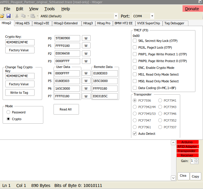 Mit Proxmark3 findet er die originalen Schlüssel nicht, aber die neuen: [+] UID: edf1048f [=] Hitag2 tag information [=] ------------------------------------ [+] Config byte : 0x06 [ 00000110 ] [+] Encoding : Manchester [+] Version : Hitag2 [+] Coding in HITAG 2 operation: manchester [+] Tag is in : Password mode [+] Page 6,7 : RW [+] Page 4,5 : RW [+] Page 3 : RW [+] Page 1,2 : RW [=] ------------------------------------ [=] 00 | ED F1 04 8F | .... [=] 01 | 4D 49 4B 52 | MIKR [=] 02 | 00 00 4F 4E | ..ON [=] 03 | 06 AA 48 54 | ..HT [=] 04 | 55 1C E9 62 | U..b [=] 05 | AA E3 16 9D | .... [=] 06 | 0A 55 FF FF | .U.. [=] 07 | FF FF FF FF | .... [=] 08 | 00 00 00 00 | .... [=] 09 | 00 00 00 00 | .... [=] 10 | 00 00 00 00 | .... [=] 11 | 00 00 00 00 | .... [=] -------- Possible de-scramble patterns --------- [+] Paxton id: 105542861 | 0x64a74cd