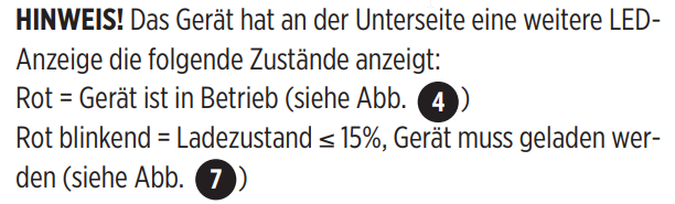 Mh... die rote LED dürfte leuchten sobald Ladestrom fließt. Aber im Betrieb? Und blinken wenn Ladezustand unter 15%???? Mhh.. Zeig doch mal bitte ein Foto des ominösen Wechselspannungsladegerät