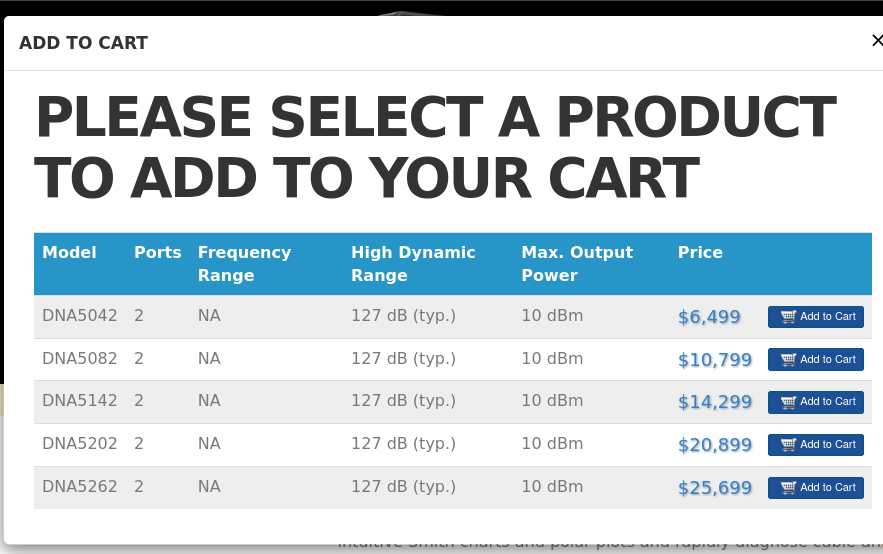 allowing every engineer to affordably add VNA to their test bench. The DNA5000/6000 series delivers solid core RF specifications making it ideal for most R&D and troubleshooting tasks both at the bench and automated production environments. With a frequency range of 5kHz to 26.5GHz, 2 or 4 ports and a wide dynamic range exceeding 120dB |