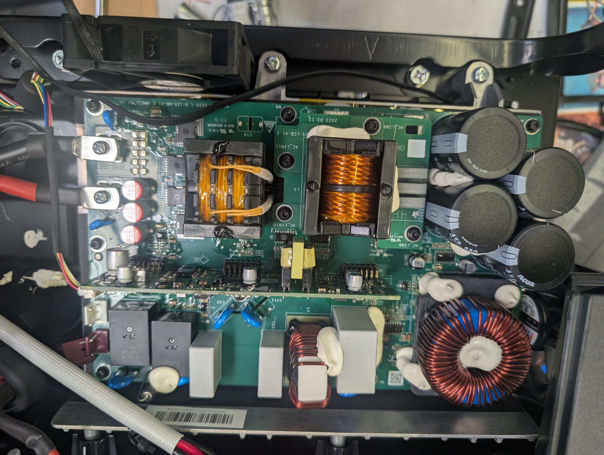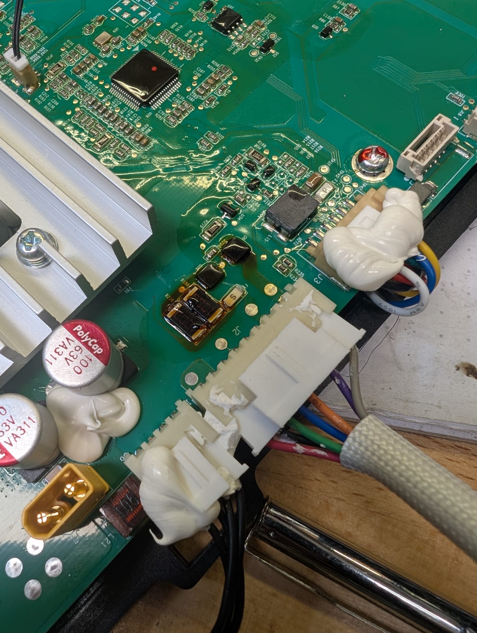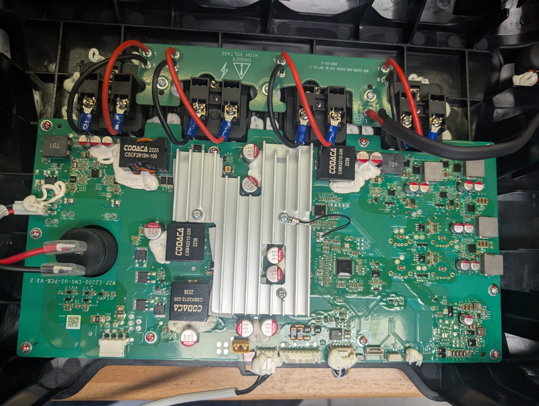 Hallo zusammen, habe gestern eine AlphaEss BlackBee2000 Powerstation bekommen. Es hieß: Geht nicht, guck mal nach. Also erstmal 230V dran mit nem Energiemessgerät, da tut sich nichts. Keinerlei Leistungsaufnahme. Das Display bleibt dunkel, lässt sich auch mit längerem Drücken auf den Einschaltknopf nicht einschalten. Also die Kiste mal aufgeschraubt. Es gibt zwei Platinen im Gerät. Die Displayplatine, mit allem ohne größere Leistung und Ansteuerung. D.h. Laderegler für USB, Ansteuerung des Displays, Spannungsversorgung für die Zigarettenanzünderbuchse etc. Leistungselektronik mit dem Inverter auf 230V und der Ladeschaltung für den Akku. Nicht weiter Analysiert, außer die Netzsicherung zu prüfen. Diese ist i.O. Auf der Displayplatine sind mir zwei Shunts aufegfallen, bei denen das Coating verdächtig braun ist. Aber sowohl die Shunts, als auch die Sicherung daneben (und auch die daneben) sind alle in Ordnung. Oberhalb dieser Shunts kommt ein Stecker mit 7 Adern, welche direkt an den Akku gehen. Dort messe ich noch zwischen grau und lila 2,7V. Ansonsten 0V. Kurzschlüsse am Mosfet sind keine vorhanden. Zudem habe ich auf der Platine noch einen komplett verbrannten Shunt gefunden. Es handelt sich dabei um den Shunt eines SW3517S. Der für die Versorgung der USB Ports zuständig ist. Da die Schaltung auch zweimal aufgebaut ist, lässt sich diese gut gegen messen und auch vergleichen. Der Shunt hängt direkt vor der Drossel. Ein Datenblatt von einem SW3517S habe ich nicht gefunden, aber von einem SW3518S. Ich gehe mal davon aus, dass sich diese sehr ähnlich sind. Aufälligkeiten beim Messen haben sich keine ergeben. https://jlcpcb.com/partdetail/ISMARTWARE-SW3518S/C406811 Zu dem Akku. Leider bin ich in der akkuthematik nicht tief drin. An den Polen des Akkus messen ich 0V. Ein Typenschild habe ich auch nicht gefunden. Lediglich ein Aufkleber auf dem steht: L248PS007CSR4234U006R Evtl lässt sich aus dieser Bezeichnung eine Spannung von 24V oder 48V abschätzen. Die Spannungen zwischen lila und grau sind noch da. Das wars. Ob oben auf dem Akku noch ein BMS drin sitzt, welches evtl wieder aufwacht, wenn man Spannung anlegt, weiß ich nicht. Was wäre euer rat, wie man vorgeht? Erstmal den defekten USB Controller ablöten? Viele Grüße Chris