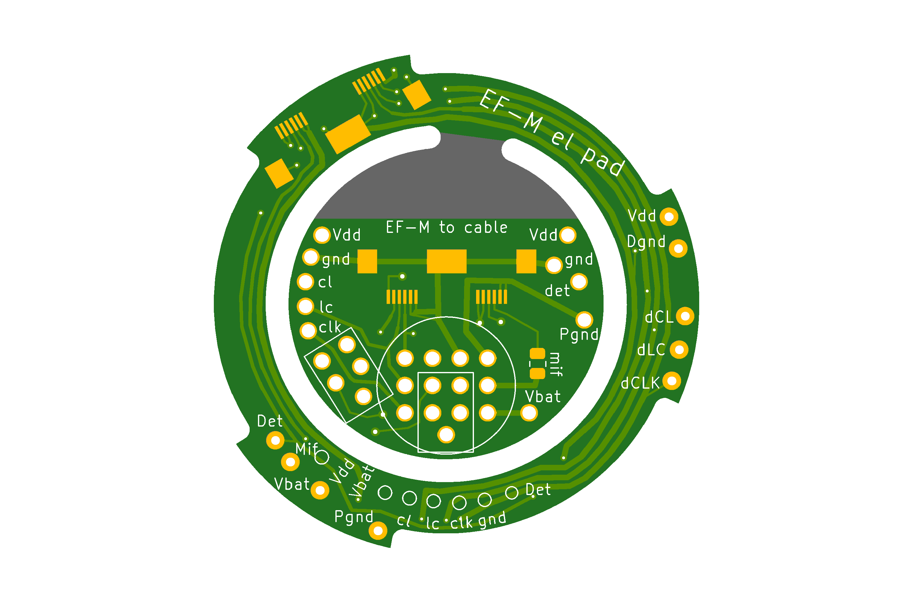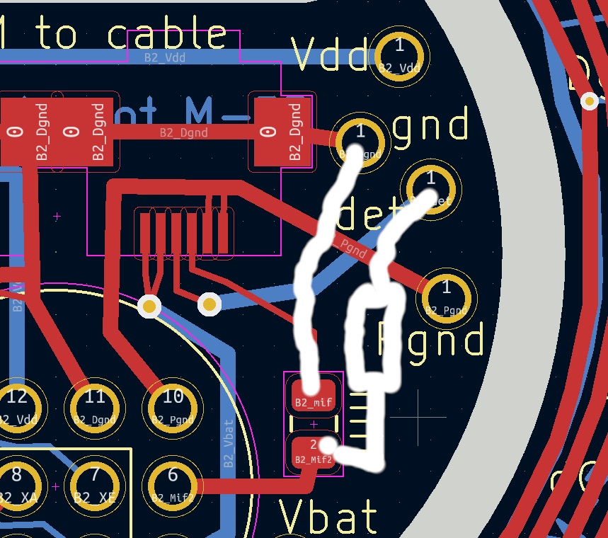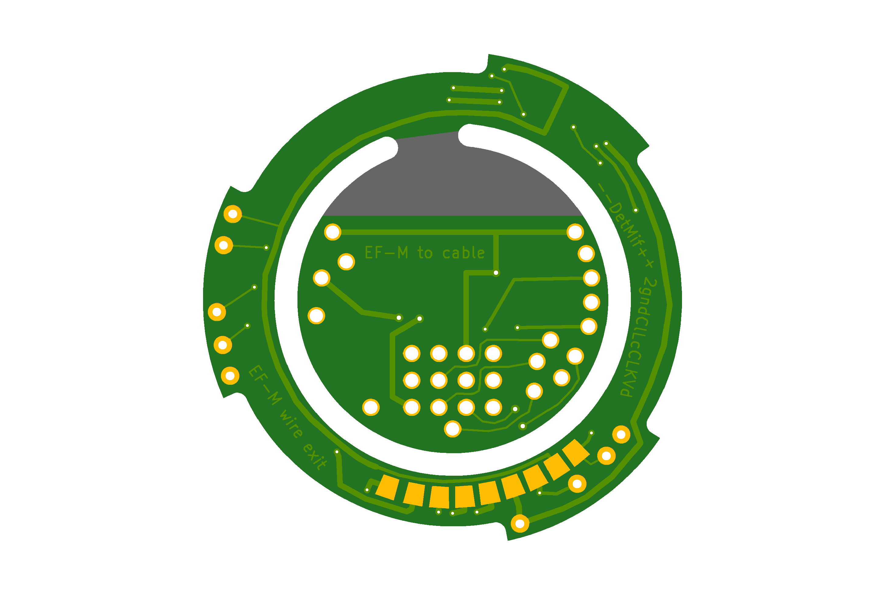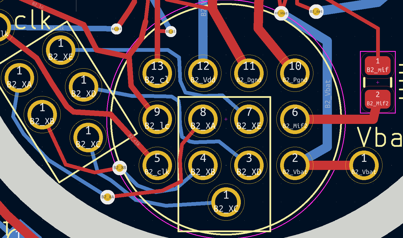 Jan B. schrieb: > Mal > sehen, vllt mache ich sowas mit 'ner ringförmigen Platine im Bajonett, > und von da mit diesem gerade erworbenen flexkabel raus. Ich fürchte, so werde ich's machen müssen. Ist zwar nervig und teuer, aber immerhin sollte es so auch bei einem Wechsel auf andere EOS-M noch funktionieren. Und der Eingriff lässt sich vllt relativ zügig rückgängig machen und/oder leicht mit anderen Basteleien (z.B. Wechsel des EF-Bajonetts über 13-pol Diodenstecker, s. Bilder; also bspw für Makrofotografie das eine EF-Bajonett in Retro, und für Tilt ein weiteres). Einen ersten Platinenentwurf habe ich schonmal (Bilder aus Vorschau von Beta-Layout Bestellsystem). Boah war das stressig. KiCad arbeitet leider noch nicht besonders gut mit Inkscape zusammen. Ich traue mich jetzt nichtmal, da die Innenfräsung zwecks leichterer Trennung noch anzupassen. Und dazu noch wegen der Kreisform komplett freiwinklig verlegte Bahnen nur. Meint ihr das geht in Ordnung, Vdd nur eine Leitung in RM.5 Flexkabel, dGND, Pgnd und Vbat je zwei?