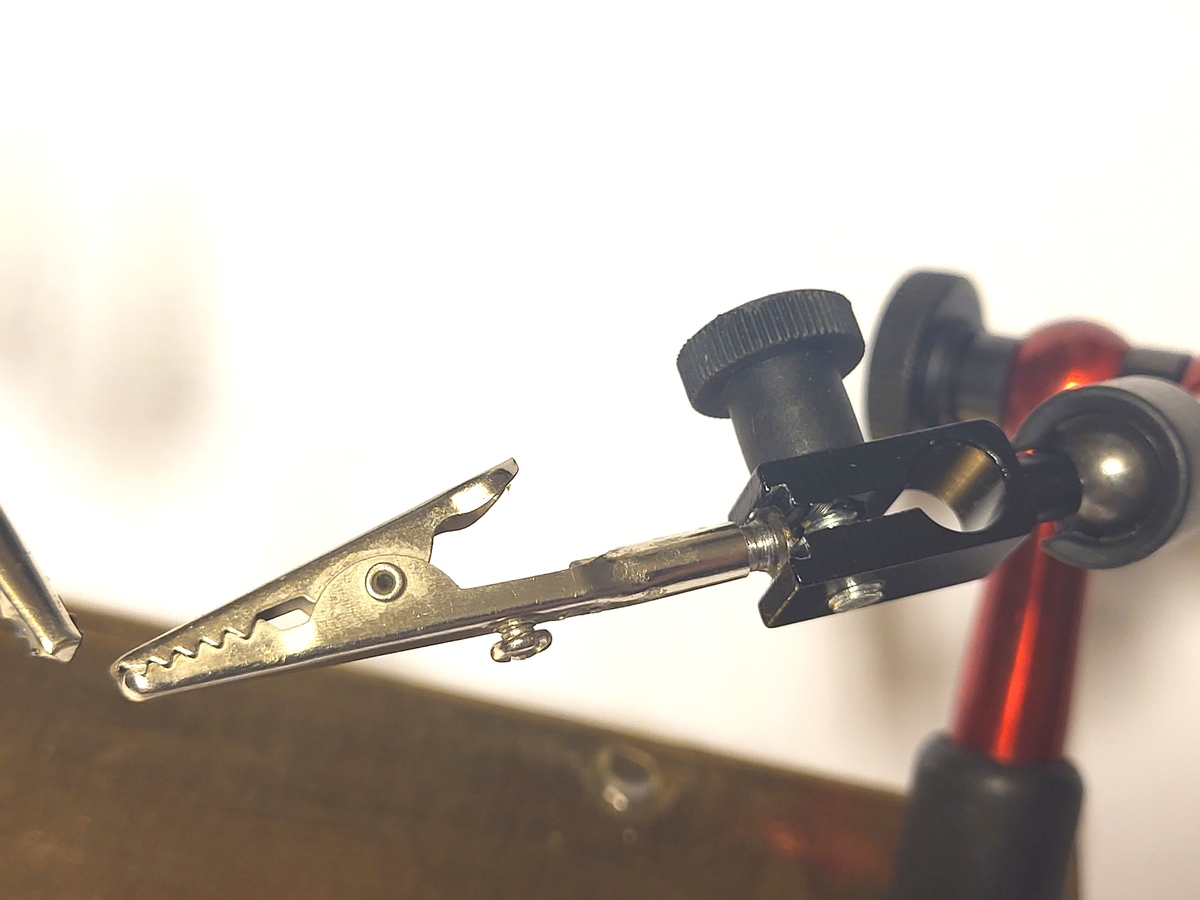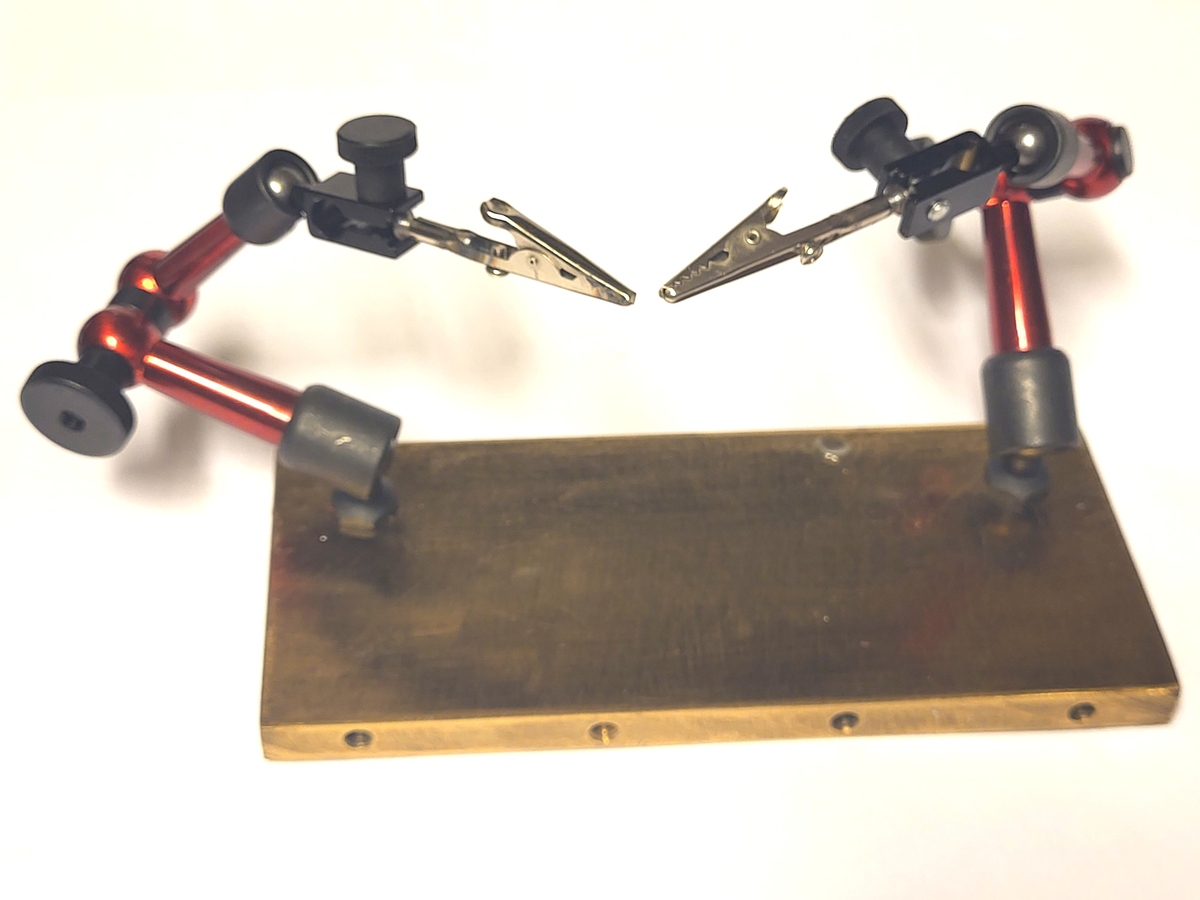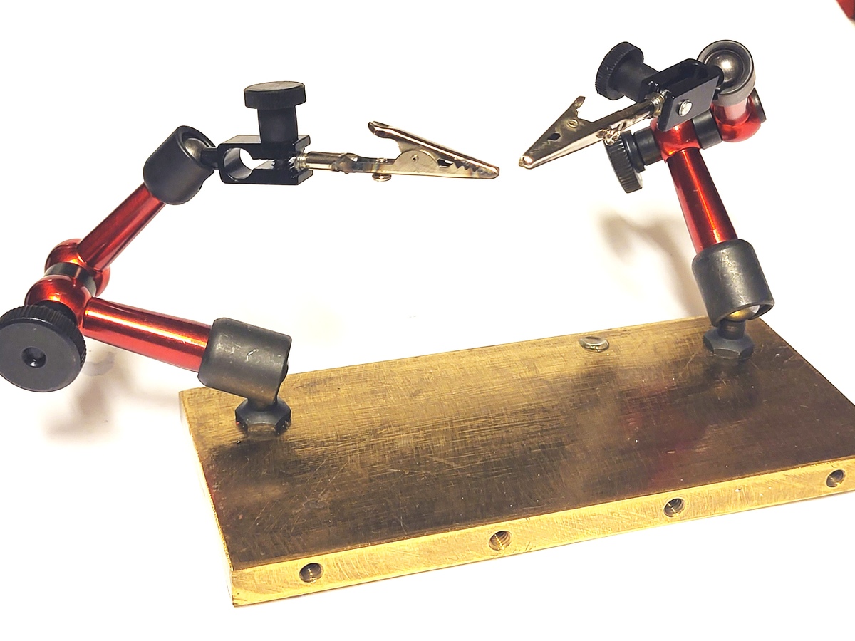Jeder der lötet hat wohl dieses 2armige Ding, an dem man mit einem halben Dutzend Schrauben die Position der Lötobjekte mehr oder weniger umständlich justieren muss. Die hier vorgestellte Löthilfe ist zwar nicht meine Idee, aber ich kann sie nur empfehlen. Die eigentlichen Arme sind Halter (meist noch mit Magnetfuss) für Messuhren, preiswert bei den einschlägigen Chinaversendern zu haben. Als Grundplatte habe ich eine gerade vorhandene Messingplatte (200mm x 140mm x 10mm) verwendet. Kann natürlich auch eine ordinäre Eisenplatte sein. Die Platte sollte nicht zu leicht sein und am Unterboden mit kleinen selbstklebenden Silikonfüßchen gegen verrutschen ausgerüstet sein. In die Krokodilklemmen habe ich Schrauben mit Senkkopf eingeklebt, damit der Senkkopf in die Klemme der Arme festgespannt werden kann. Eventuell muss der Senkkopf etwas befeilt werden, damit er straff in die Klemme eingesetzt werden kann.