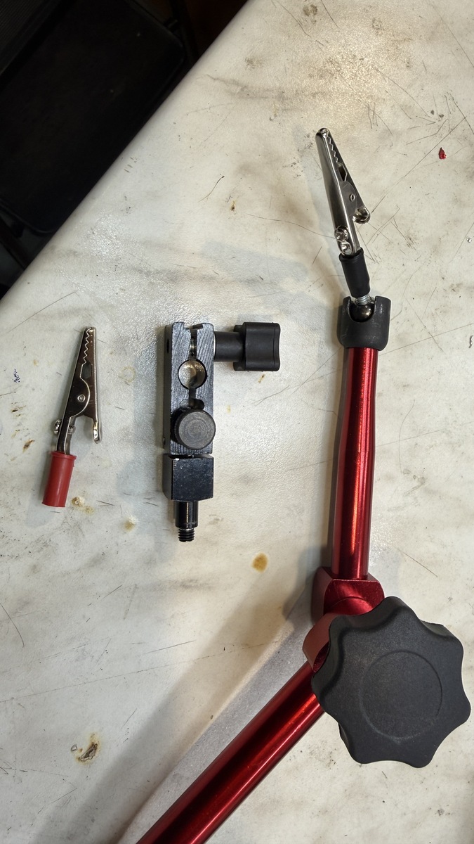 Coole Idee, danke. Mir war nicht bewußt daß diese Meßuhrarme mit einer zentralen Schraube festgestellt werden können. Hilft wirklich ungemein. Habe die Arme so modifiziert daß aus der Kugel nur eine kurze M5 Gewindestange heraussteht. Da paßt dann sowohl eine Krokoklemme wie auch der vorherige Klemmmechanismus für die Uhr drauf. Oder was auch immer. Und als Befestigung einfach ein paar M8 Rampa Muffen in die Arbeitsplatte gebohrt.