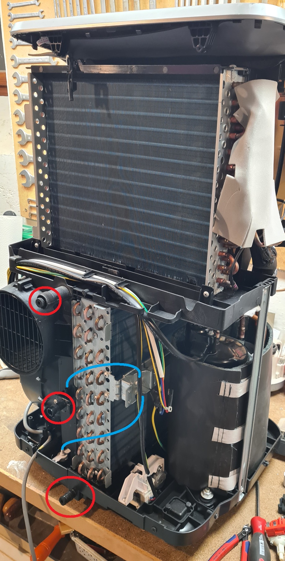 Guten Tag zusammen, ich brauche mal etwas Schwarmintelligenz, weil ich mir bei meinem Vorhaben noch nicht ganz sicher bin. Ich habe das AEG Chillflex Monoblock, das heizen, und kühlen kann. Ich habe es aktuell auf meiner Werkbank, weil die Kühlwasserpumpe kaputt gegangen ist (die es natürlich nur in China gibt. Austausch ist unterwegs). Bis dahin überlege ich gerade an einer Sache, die mich schon immer stört: Das Kondenswasser-Management. Man sieht auf dem Bild drei rote Kreise. Der oberste Auslass ist der Kondenswasserauslass beim kühlen. Wenn dort kein Schlauch angeschlossen ist, läuft das Kondenswasser ab einem bestimmten Füllstand in den zweiten Wärmetauscher unten und wird dort verdunstet. Wenn weniger Wasser verdunstet wird, als anfällt, dann pumpt eine Pumpe das Wasser hoch zum mittleren Auslass. Lt. Anleitung soll man im Kühlbetrieb den obersten Auslass benutzen (oder gar keinen). Beim Entfeuchterbetrieb heizt der obere Wärmetauscher und Kondenswasser fällt am untersten Auslass an. Der ist aber so tief, dass man dort keinen Behälter hinstellen kann. Das Wasser wird also regelmäßig zum mittleren Auslass hochgepumpt. Im Heizbetrieb das gleiche. Je nach Betriebsart also soll man ständig Schläuche tauschen und das macht für mich keinen großen Sinn. Meine Idee war, den mittleren Auslass totzulegen und das Kondenswasser in die oberste Wanne laufen zu lassen. Dann könnte der Schlauch immer am obersten Auslass bleiben. Wenn der Auslass zu ist, wird natürlich irgendwann Kondenswasser heruntertropfen und am unteren Wärmetauscher gefrieren, daher darf man dann das Gerät nicht mehr ohne Schlauch im Heiz/Trocknungsbetrieb nutzen. Die Wanne oben ist so gestaltet, dass der Überlauf zum unteren Tauscher erst ab einem gewissen Füllstand erfolgt. Was denkt ihr darüber?