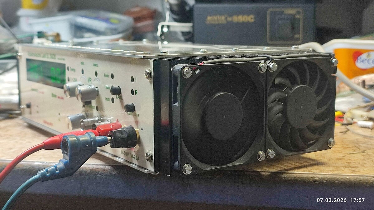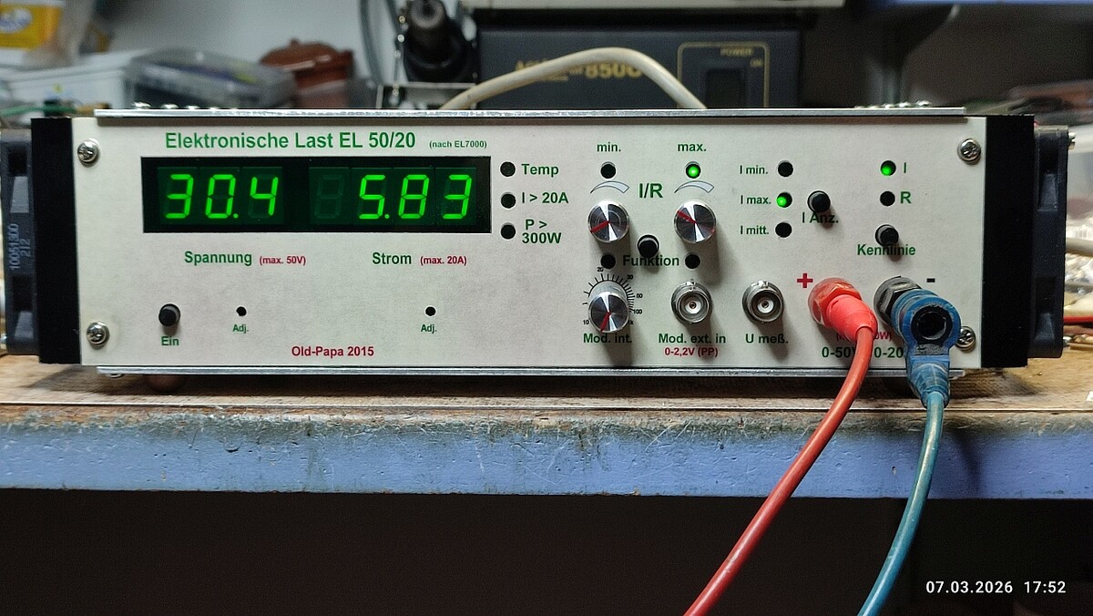 Vor vielen Jahren hatte ich ja schonmal ein paar Worte zu dieser EL7000 verloren. Damals suchte ich nach einem runden Nachbaukonzept mit etwas mehr Leistung, wurde aber nicht wirklich fündig. Die Reste meiner EL7000 (Platinen, prog. Chip usw.) habe ich damals also wieder hervorgekramt und etwas modifiziert aufgebaut. Soweit, so gut... Heute hatte ich etwas "Marakel" mit dem Ding und wieder reingeschaut. Dabei ist mir wieder auf- und eingefallen, dass damals statt dem programmierten Chip (ein GAL?) eine kleine Tochterplatine ebenfalls mit programmierten Chip geliefert wurde. Leider habe ich genau dazu keinerlei Schaltplan noch eine Begründung, warum verändert. Hat also vielleicht irgendwer das Ding auch gebaut und vielleicht sogar mit dieser Tochterplatine. Hier noch zwei Fotos meines etwas potenteren Aufbaus in eigenem Gehäuse und mit zwei seitlich angebauten größeren Kühlkörpern. Damit konnte ich die Leistung deutlich erhöhen und so hat das auch immer funktioniert. Derzeit spinnt (wackelt) die Einstellung vom Strom etwas, Poti usw. sind aber ok. Old-Papa