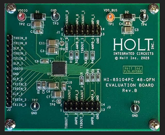 The board demonstrates the HI-85104’s advanced protection architecture. Each transmit channel includes internal short-circuit protection, ensuring other channels continue operating normally even if an individual output is shorted to ground or another line. The device resumes normal transmission automatically when the fault is removed. |
