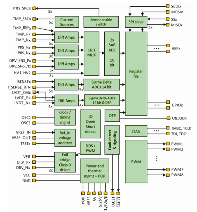 • 5 current sense interfaces via 5 dedicated Σ-Δ ADCs |