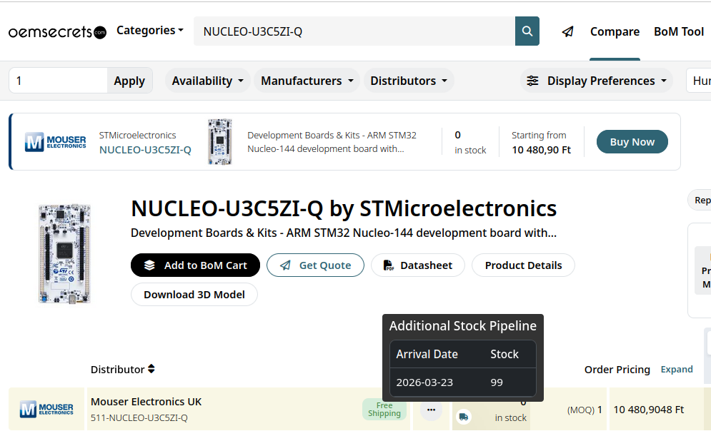 Auch das als NUCLEO-U3C5ZI-Q bezeichnete Evaluationsboard ist zum Zeitpunkt der Abfassung dieser Newsmeldung noch nicht allgemein verfügbar. Hier gilt allerdings, dass Distributoren - wie in der Abbildung gezeigt - teilweise schon mit Lieferterminen zu werben wissen.
