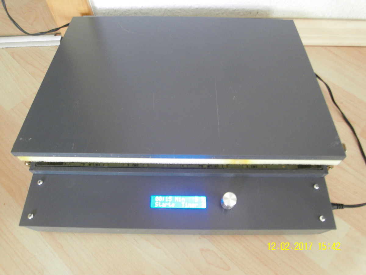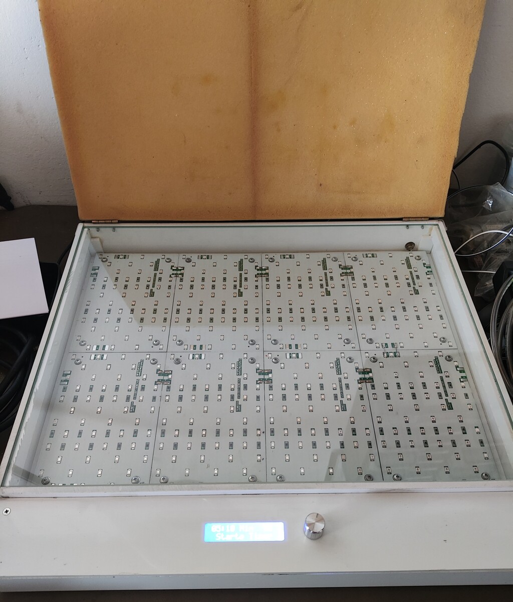Nachtrag: Betriebspannung: 12 Volt Größe der Belichtungsplatine: 100X160 mm Belichtungsfläche: 120 X 180 mm Verbrauch max.: 5 Watt Anzahl der UV-LEDs: 48 Belichtungsdistanz: 40mm Belichtungsdauer für Bungard Platinen (Getestet): 1:30 Minuten Bei Interesse bitte E-Mail an mich. Vielen Dank