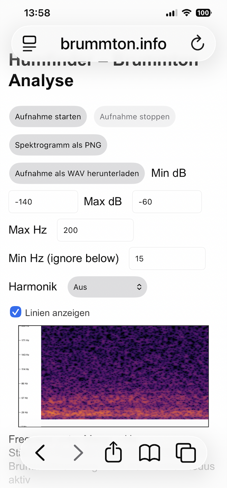 Hallo Allerseits, ich lese hier schon eine Weile mit und hoffe sehr auf eure Einschätzung. Wir sind vor einigen Monaten in ein neues Haus eingezogen (mit Wärmepumpe). Direkt in der ersten Nacht habe ich ein dauerhaftes Surren kombiniert mit einem tiefen Brummen (definitiv unter 100 Hz) wahrgenommen. Zunächst dachte ich, das Surren komme von der Wärmepumpe und das Brummen vielleicht von einer Baustelle. Ein Bauakustiker hat damals mit Mikrofonen und Beschleunigungssensoren gemessen, allerdings hauptsächlich im Wärmepumpenbetrieb, weil wir zu dem Zeitpunkt noch sicher waren, dass alles von der Anlage kommt. Dabei wurden tatsächlich Peaks bei etwa 300 und 600 Hz gemessen, die exakt den Frequenzen der Umwälzpumpen entsprachen. An den jetzigen warmen Tagen konnten wir die Wärmepumpe komplett ausschalten. Beide Geräusche blieben jedoch unverändert bestehen. Ich bin bisher die Einzige, die das dauerhaft hört. Allerdings hatte das, was ich früher wahrgenommen habe, immer eine reale Ursache. Unsere alte Wohnung haben wir noch nicht gekündigt, damit ich dort zur „akustischen Erholung“ immer wieder ein paar Tage wohnen kann. Das Geräusch tritt dort überhaupt nicht auf. Es ist nur in diesem Haus vorhanden; draußen um das Haus rum hört man nichts. Auch mein HNO-Arzt tendiert daher eher gegen eine Tinnitus-Diagnose, obwohl mir diese inzwischen fast lieber wäre - sozusagen das kleinere Übel. Was wir bereits versucht haben: • Strom im Haus komplett ausgeschaltet • Wasser abgestellt (Rohre sind auch ruhig) • das ganze Haus mit Stethoskop abgehört • Umgebung abgefahren Bisher ohne Ergebnis. Zur Umgebung: • ruhige EFH-Wohngegend • Trafostation etwa 100 m entfernt (von außen unauffällig) • Nachbargrundstücke akustisch unauffällig, wobei natürlich z. B. Erdwärmepumpen oder Grundwasserpumpen im Keller denkbar wären • Abwasserpumpwerk etwa 1 km entfernt • Windräder, Kläranlage, Autobahn, Landstraße und Bahnstrecke jeweils ca. 5 km entfernt Natürlich würde ich am liebsten einmal systematisch prüfen, ob eine Anlage in der Nachbarschaft die Ursache sein könnte (z. B. Heizungen/Pumpen kurz abschalten). Als Neuling hier fällt es mir allerdings noch etwas schwer, die Nachbarn damit direkt zu behelligen. Ich taste mich da vorsichtig heran. Gestern habe ich außerdem bei ne…an.de nach Hinweisen aus der Umgebung gefragt. Zu meiner Überraschung meldeten sich zwei Familien aus der Nähe, eine sogar aus unserer Straße. Eine davon beschreibt fast exakt meine Wahrnehmung: „Bei uns ist es genau dasselbe – neu hergezogen und es brummt. Wir haben auch alles ausgemacht, sogar das Wasser, aber der Brummton bleibt. Es ist ein bei normaler Lautstärke kaum wahrnehmbares Dröhnen mit Druck auf den Ohren. Draußen hören wir es ebenfalls, allerdings deutlich schwächer.“ Meine Bitte an euch: Könntet ihr einen Blick auf die angehängten Spektrogramme/FFTs werfen und einschätzen, ob da etwas nach realem „Brummen“ aussieht? • Das Spectrum-Bild mit der 627-Hz-Spitze stammt vom Bauakustiker. • Die SpectrumView-Bilder sind von mir (Spectrum läuft auf unseren iPhones leider nicht). Dezibelmesser zeigt nur ca 26 db in den Räumen an. Messbedingungen: Neubau, alle Fenster zu, kein Verkehr in der Nähe, Strom komplett aus. Messbilder so täglich reproduzierbar. • Das vorletzte Bild mit der 63 Hz-Spitze zeigt einen Spectrum-Screenshot des Brummens der erwähnten Nachbarn. • Das letzte Bild (lila-orange) ist mit "Humfinder" gemessen ebenfalls aus unserem Haus Das Brummen belastet uns sehr. Umso dankbarer bin ich für jeden konstruktiven Hinweis/Rat. Vielen Dank euch im Voraus!