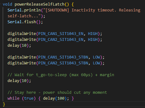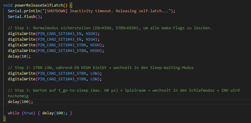 Danke für deine schnelle Antwort Kai, ich habe mein Code angepasst! Leider schaltet der Mosfet noch immer nicht im Sleep Modus, am INH Pin messe ich weiterhin Normal = 10,780V und Sleep = 10,112V.