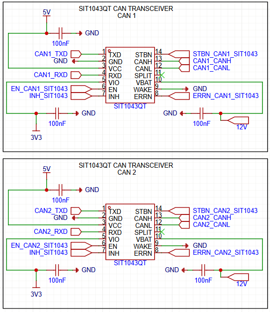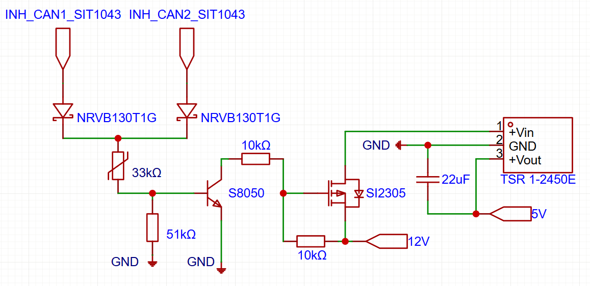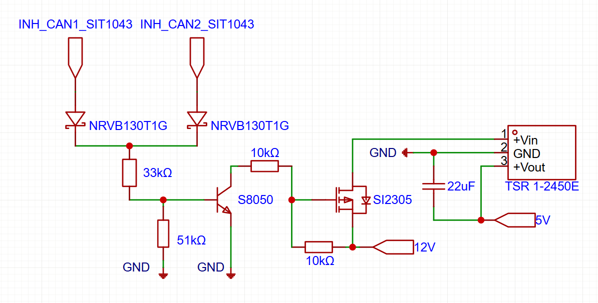 Hallo zusammen, ich arbeite an meinem ersten PCB-Design, einem CAN-Bus-Router-Board mit einem ESP32-S3 und 12V-Eingangsspannung. Das Board verfügt über eine Selbsthalte-Stromversorgung (Self-Latch-Schaltung), die sich nach 2 Minuten CAN-Bus-Inaktivität eigentlich selbst ausschalten soll. Das Problem ist, dass der MOSFET einfach nicht abschaltet. Wie die Schaltung funktioniert: Das Board hat zwei SIT1043QT CAN-Transceiver. Deren INH-Pins (Pin 7, Open-Drain-Ausgang) sind miteinander verbunden und über einen 10kΩ-Widerstand an die Basis eines S8050 NPN-Transistors angeschlossen. An der Basis hängt außerdem ein 4,7kΩ Pull-down-Widerstand gegen GND. Der Kollektor des S8050 geht über einen 10kΩ-Widerstand an das Gate eines SI2305 P-MOSFETs. Das Gate hat zudem einen 10kΩ Pull-up nach 12V. Die Source des SI2305 ist mit 12V verbunden, und der Drain speist einen TSR 1-2450E Spannungsregler (12V auf 5V), der den ESP32 versorgt. Das gewünschte Verhalten: Wenn CAN-Aktivität vorliegt, befinden sich die SIT1043 im Normal-Modus, INH ist HIGH, der NPN leitet, zieht das MOSFET-Gate auf LOW und der MOSFET schaltet durch. Wenn der ESP32 2 Minuten Inaktivität erkennt, versetzt er die SIT1043 in den Sleep-Modus (EN=HIGH, STBN=LOW). INH sollte dann hochohmig (High-Z) werden, der 4,7kΩ Pull-down zieht die Basis auf GND, der NPN sperrt, der 10kΩ Pull-up zieht das Gate auf 12V und der MOSFET schaltet ab. Das Problem: Die INH-Pins beider SIT1043 bleiben bei ca. 10V, unabhängig vom Betriebsmodus (Normal = 10,780V, Sleep = 10,112V). Ich habe überprüft, ob die EN- und STBN-Pins an den SIT1043 die korrekten Spannungspegel haben. VCC liegt bei 5V, VBAT bei 12V. Wenn ich das INH-Netz manuell mit einem Kabel auf GND ziehe, schaltet sich die gesamte Schaltung korrekt ab. Außerdem habe ich den Widerstand der INH-Pins bei stromlosem Board gemessen: 14,6kΩ zwischen INH und GND, was exakt den externen Widerständen entspricht (10kΩ + 4,7kΩ in Reihe).