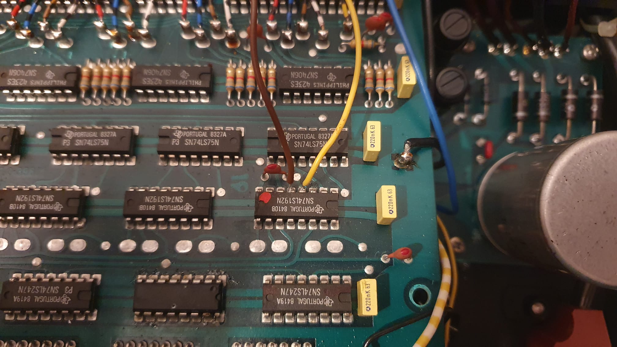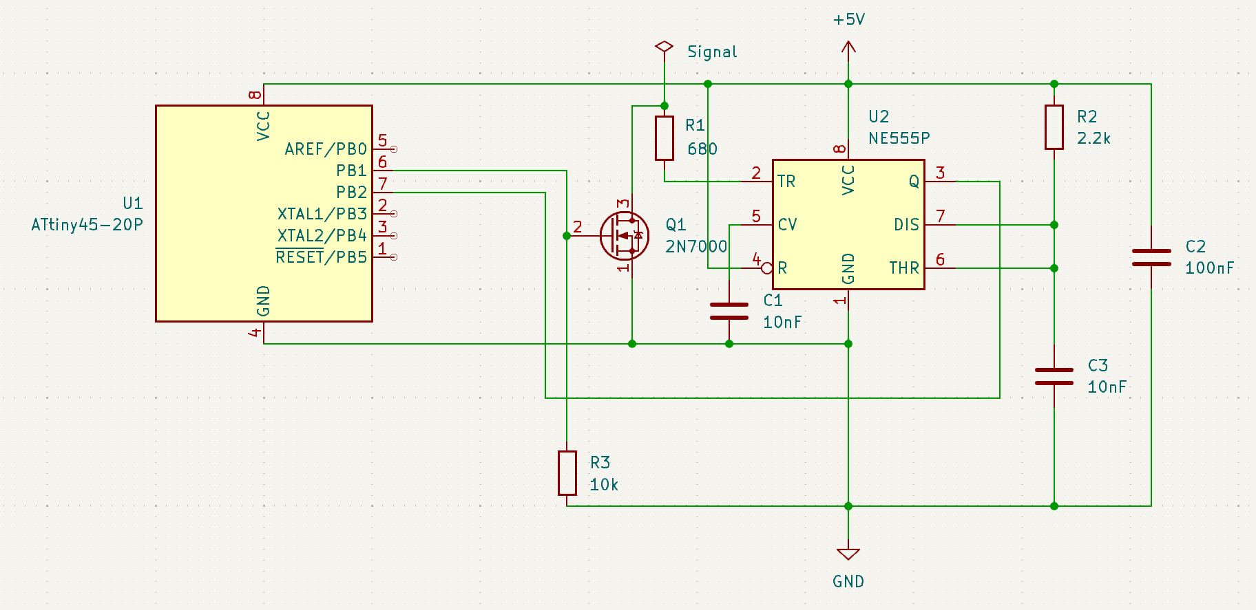 Hallo Ich hatte mir eine Alte Digitalanzeige von Heidenhain für unsere Fräsmaschine gekauft. Jedoch hat die Signalauswertung der Anzeige nicht zur Fräse gepasst. D.h. bei einer Umdrehung am Handrad (2,5mm) hat die Anzeige nur 1,25mm angezeigt. Lösung: Daraufhin habe ich einen Impulsverdoppler gebaut und möchte diesen hier zum Nachbauen teilen. Das ist nur ein möglicher Ansatz, und wahrscheinlich auch nicht die einfachste Lösung, aber sie funktioniert. Aufbau: Umgesetzt mit einem NE555 und einen uC (hier Attiny45, kann aber auch ESP oder Arduino genutzt werden). In "Digitalanzeige2" sieht man das PCB mit Beschriftungen der IC´s. In "Digitalanzeige" sind 2 Leitungen an den Pins 4 & 5 des ersten SN74LS192N (4-Bit aufwärts/abwärtszähler). Dort werden die ersten Zählimpulse für die 7-Segementanzeige abgegriffen. Funktion: Diese werden dann in die selbstgebaute Schaltung eingespeist. Dort werden sie vom NE555 erkannt und an den uC weitergegeben, der dann den Transistor (hier ein FET, kann aber auch BJT genutzt werden) ansteuert und den Pin des Zählers nach einem Impuls nochmals auf GND zieht für einen zweiten Impuls. Der NE555 wird benötigt, da der Impuls der Anzeige nur ~50ns lang ist und das der uC sonst nicht erkennt. Die Versorgungsspannung kommt von der Anzeige selbst (Sind Pins auf dem PCB verfügbar -> 5V !Aufpassen wegen 3,3V uC). Wichtiges: (Dieser Schaltplan ist nur für eine Zählrichtung, um beide Zählrichtungen zu verdoppeln, muss alles Außer dem NE555 verdoppelt werden und an 2 weitere I/O`s am uC gesendet werden. Zusätzlich muss der Code für den uC angepasst werden, da er auch nur für eine Zählrichtung passt. Ist aber nur Copy/Paste und den Pin anpassen.) Code: Der Code erkennt den Impuls auf dem Eingangspin, wartet kurz und gibt einen weiteren Impuls am Ausgangspin des uC aus. Es ist eine Impulssperre eingebaut, damit es zu keinem Loop kommt. Diese blockt den künstlich erzeugten Impuls des uC auf dem Eingangspin. Ich würde mich über Feedback freuen, da das mein erstes Veröffentlichtes Projekt ist.
