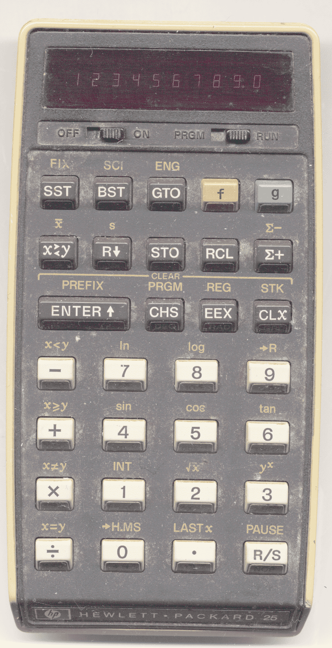 HP25 (noch ohne C), ich meine mit Studentenrabatt damals 800 DM. https://de.wikipedia.org/wiki/HP-25 natürlich auch RPN https://de.wikipedia.org/wiki/Umgekehrte_polnische_Notation Längst mit 2 Eneloop-Mignon-Zellen betrieben.