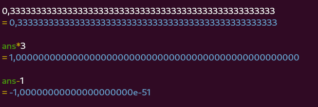 GNU bc liefert bei 1/3*3 auch 0,9 periodisch. Unabhängig wie viele Nachkommastellen. Trotzdem verwende ich ihn hin und wieder. Erst neulich bei einem Versuch zwecks Relativitätstheorie bezüglich Zeitdilatation. Hier hab ich bc verwenden müssen, da die Ergebnisse im Attosekunden Bereich waren und da auch mein TI nspire CX II-T CAS hier zu ungenau war. Im angehängten Screenshot lediglich mit 1000 (scale=1000) Nachkommastellen.