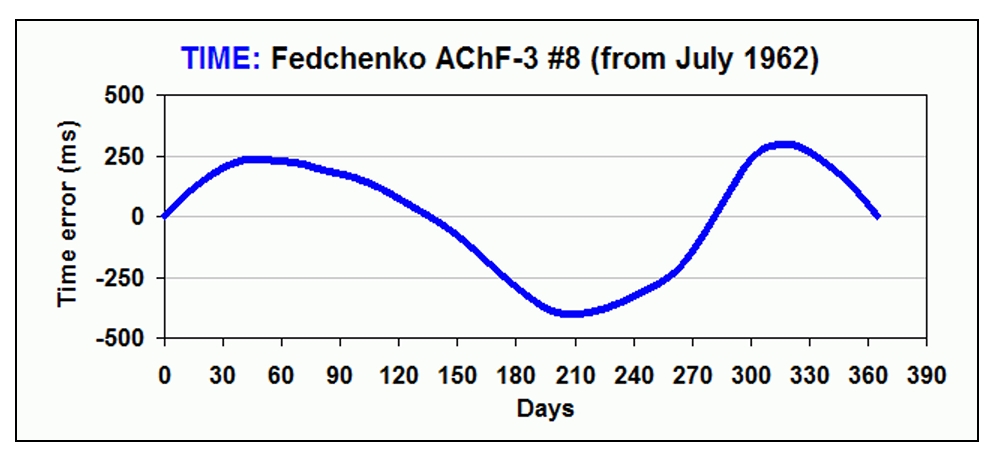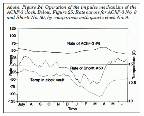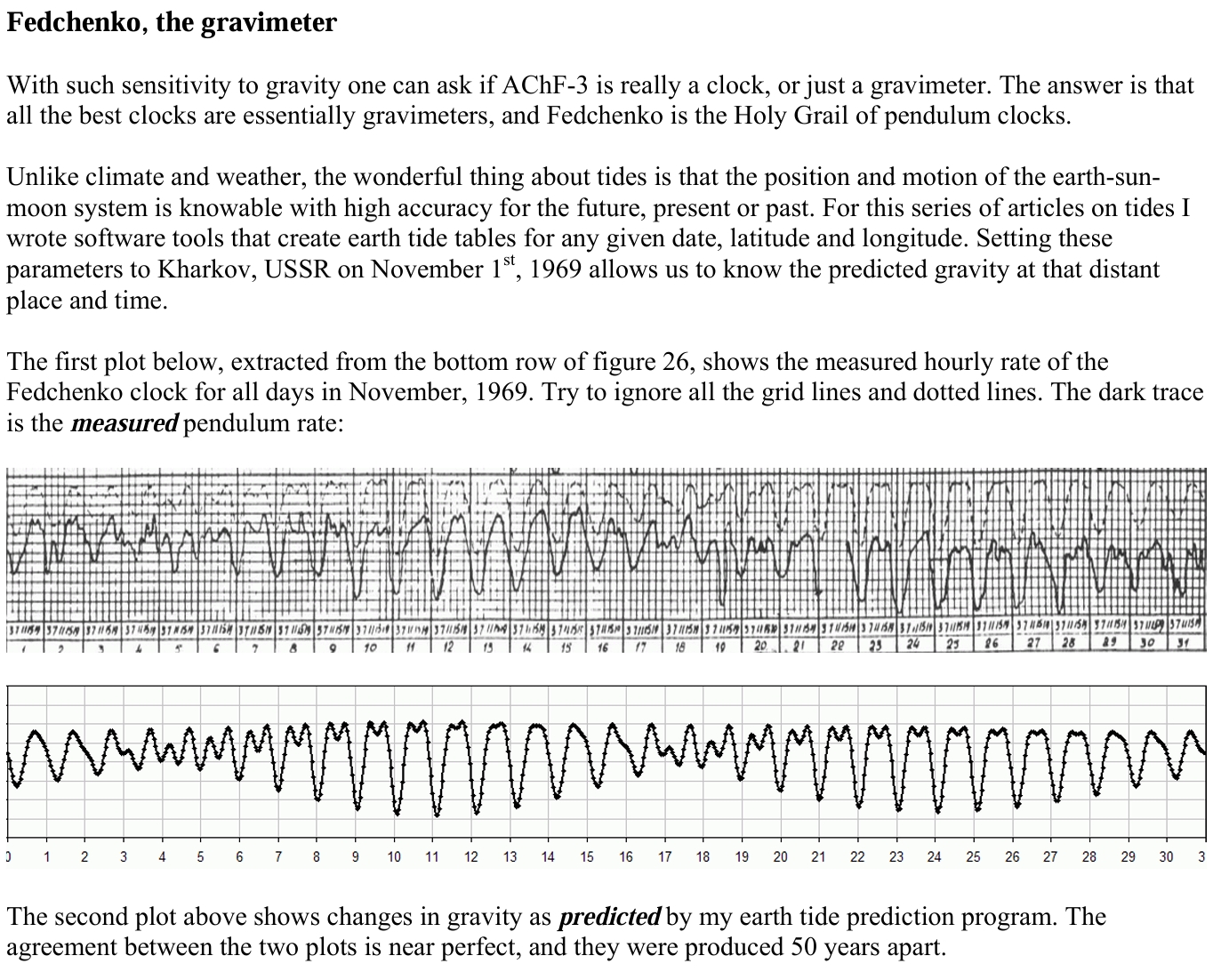 Im Bild sieht man die Genauigkeit einer Fedchenko und einer Shortt Uhr im Vergleich zu einer Quarzuhr. Die Fedchenko hat einen Offset von 48 ms/Tag. Die Shortt hat ein Temperaturproblemchen. Der Einfluss von Ebbe und Flut stimmt mit dem berechneten Einfluss gut überein. An einer Pendeluhr kann man die Mondstellung ablesen. Bei der Genauigkeitsangabe über muss man immer aufpassen, dass sich die Temperaturunterschiede Winter/Sommer und Tag/Nacht nicht aufheben. Mehr Details hier: http://leapsecond.com/hsn2006/pendulum-tides-ch5.pdf