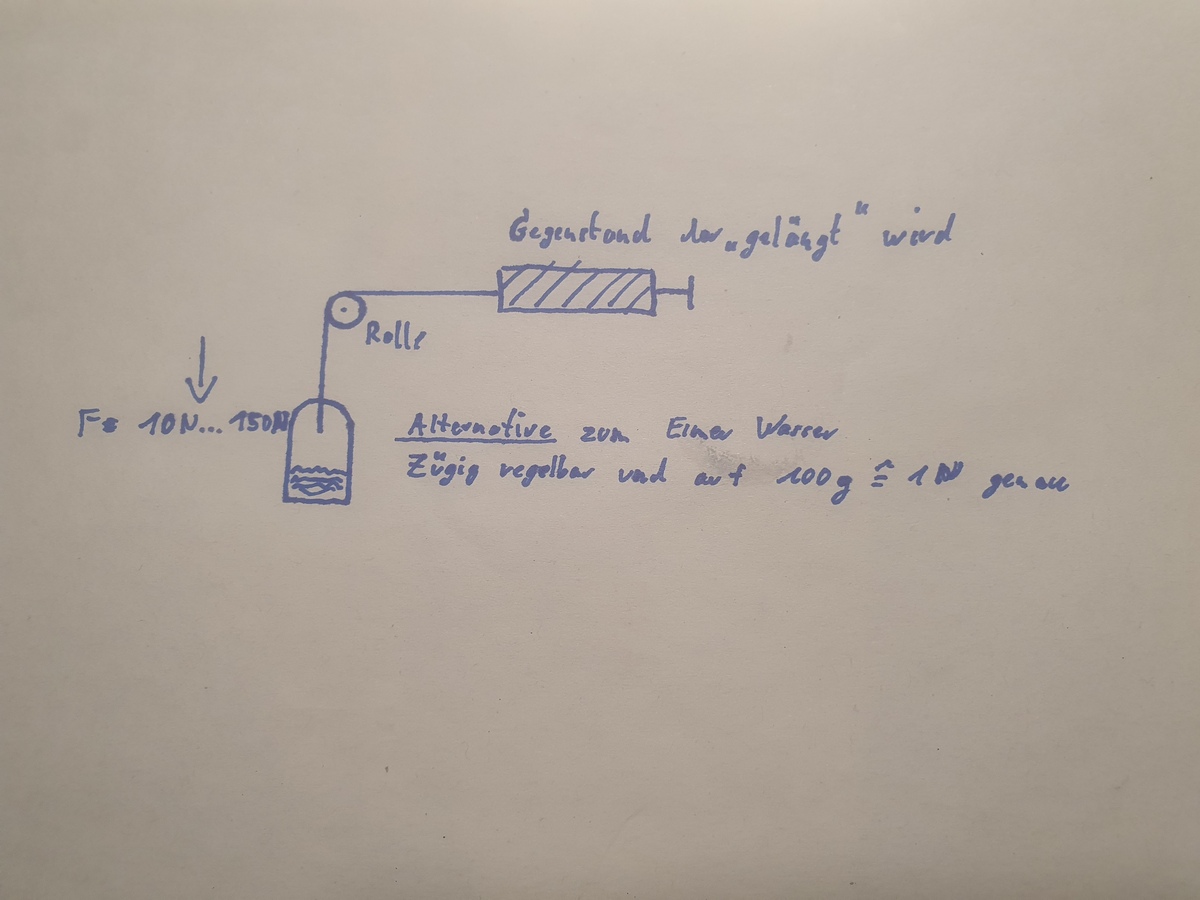 Hallo, um einen Gegenstand für etwa 1h mit einer in dieser Zeit wechselnden Zugkraft von erwa 10N bis 150N zu beaufschlagen, suche ich eine mechanische Vorrichtung. Im einfachsten Fall wären das bis zu 2 Eimer Wasser über Umlenkrolle. Ich würde hier gerne ein wasserloses System nutzen und es muss elektrusch, also über Schalter oder Poti in groben Stufen (1..2N) regelbar sein. Eine Verringerung der Zugspannung muss auch möglich sein. Mein Gefühl sagt mir, dass es schon eine mechanische Lösung für ein ähnliches Problem bereits gibt, die ich hier übernehmen könnte oder als Vorbild nehmen könnte. In Sportstudios gibt es ja elektronisch einstellbare Fitnessgeräte z.B.. Vielleicht habt ihr eine Idee. Grüße Marco / Hochfrequenz