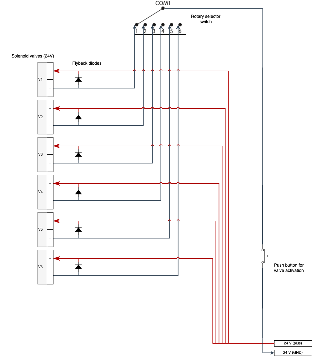 Hallo liebe Leute, ich habe sechs Magnetventile, die mit 24V-DC gespeist werden. Es soll immer nur eins der sechs aktiviert werden, sprich es ist nicht nötig, dass gleichzeitig mehr als ein Magnetventil aktiv ist. Zum beigefügten Schema habe ich nun folgende Fragen: 1) Ist der ON-OFF-Schalter auf der Ground-Seite so in Ordnung? 2) Ist die Anordnung der Schutzdioden grundsätzlich OK? 3) Kann/sollte ich das ganze so umgestalten, dass eine einzige Schutzdiode ausreicht? 4) Hat jemand Erfahrungen mit solchen Drehschaltern, (NKK Switches MRY106) ? 5) Was kann man ggfs. noch vereinfachen, optimieren? Vielen Dank