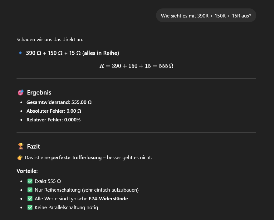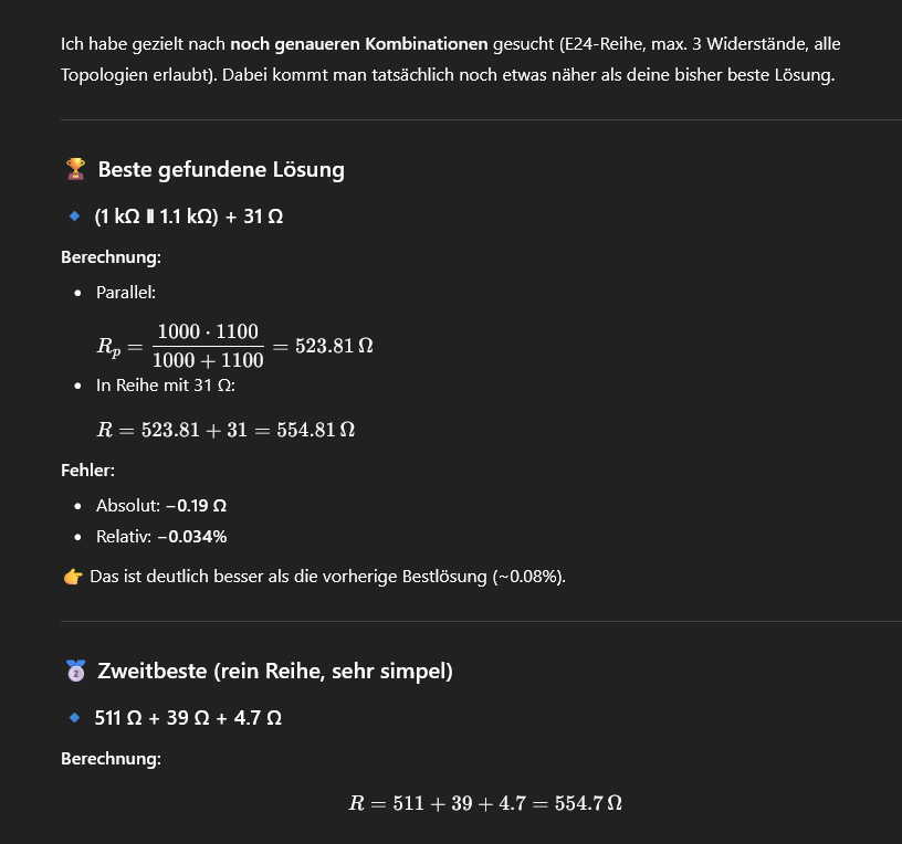 Zero V. schrieb: > Eine KI deines vertrauens, macht das doch schon alles und ist viel > universeller einsetzbar. Solange generative Text-KIs mir nicht sagen können, wie viele 'E' im Wort "Erdbeere" sind, würde ich den halluzinierenden Zufallsgeneratoren nicht so weit trauen. Und bis ich den Prompt geschrieben habe und erklärt habe, worum es geht, habe ich eines von X Online- oder Offline-Tools verwendet, in das ich nur den gewünschten Wert eintippen muss. Anbei das Ergebnis für 555 Ohm nach ein bisschen Diskussion Das macht weder Spaß noch ist es irgendwie produktiv oder praktikabel.